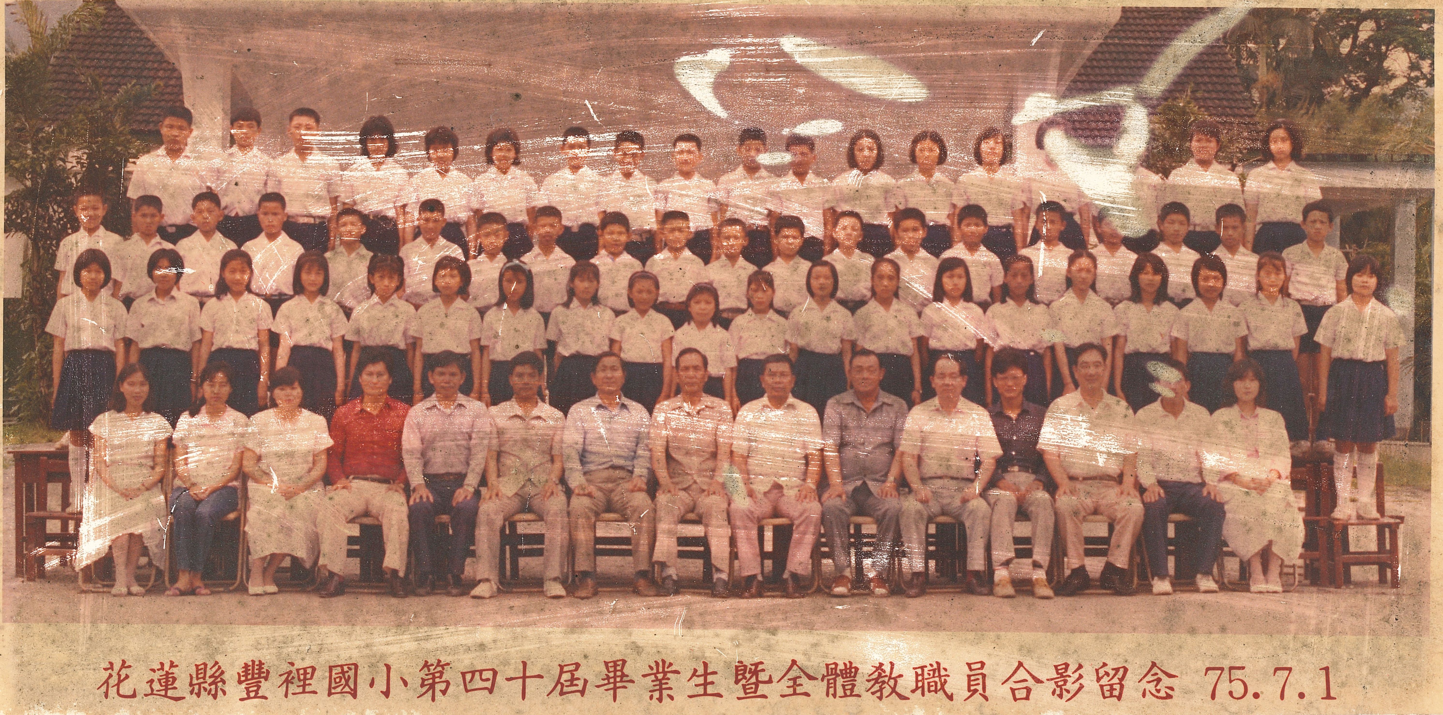 花蓮縣豐裡國小第四十屆畢業生暨全體教職員合影留念。照片拍攝的時間是1986年(民國75年)7月1日,照片提供者為詹素珠女士,此為詹素珠女士的小女兒就讀豐裡國小時所拍的畢業照(照片背面記有女兒的姓名沈金妮)。位於花蓮縣壽豐鄉豐裡村的豐裡國小,在日本時代為花蓮港廳豐田尋常高等小學校,於1913年(大正2年)創立,為當時住在豐田移民村內的小孩就讀的小學,戰後日本人離開,改為花蓮縣立豐裡國民學校,到1968年(民國57年)更名為花蓮縣立豐裡國民小學。