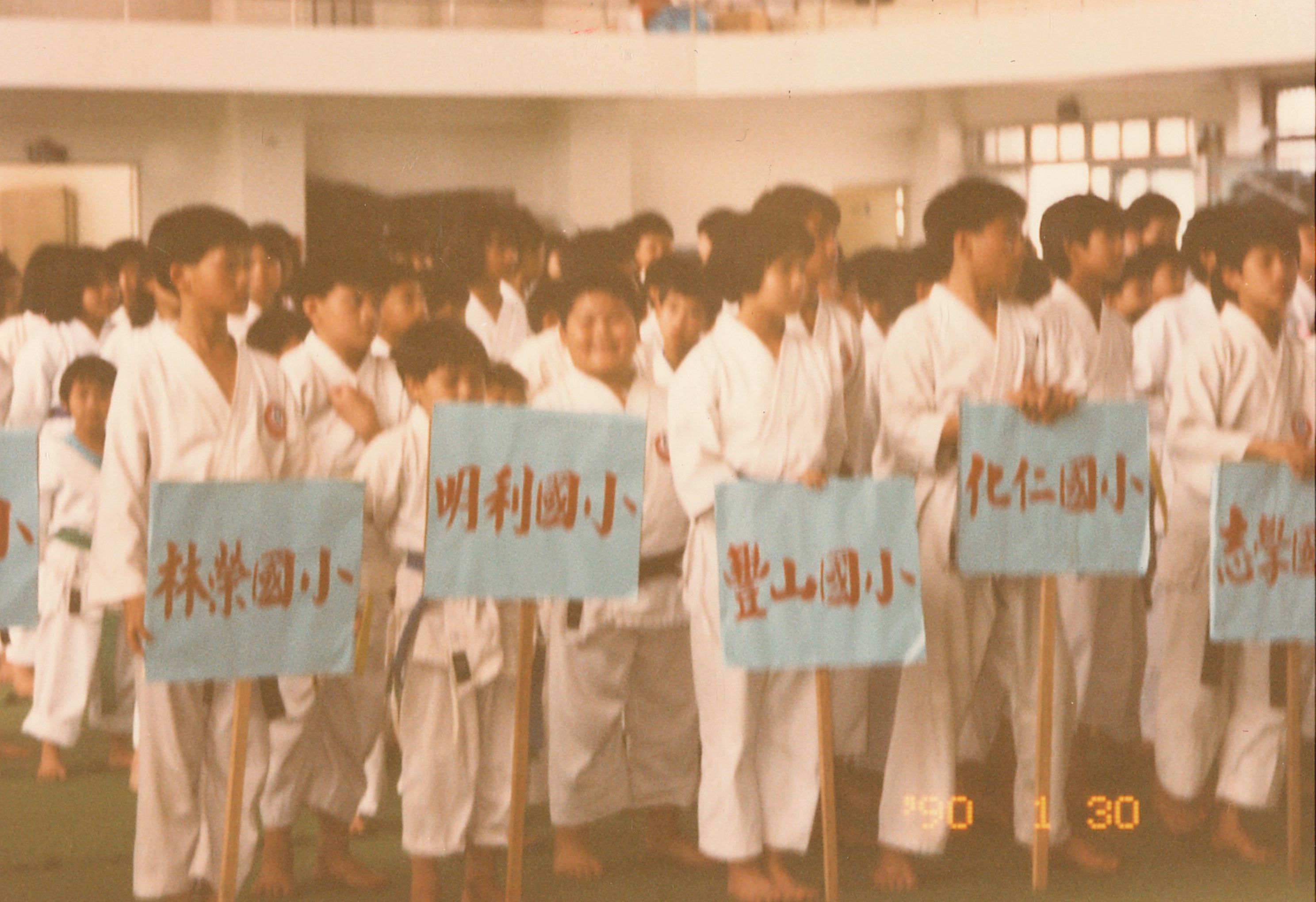 花蓮縣國小學生空手道比賽。照片拍攝的時間為西元1990年1月30日(民國79年),照片提供者為邱美華女士,此為她的大兒子參加花蓮縣體育會空手道委員會比賽的照片(代表豐山國小,排序第二位的男孩子為邱美華大兒子),這時的大兒子約國小二年級,比賽地點在花蓮市明義國小。照片可見到來自多所國小的空手道選手,身穿空手道比賽服裝,前排同學舉有學校代表名牌,例如林榮國小(花蓮鳳林鎮)、明利國小(花蓮萬榮鄉)、豐山國小(花蓮壽豐鄉)、化仁國小(花蓮吉安鄉)、志學國小等(花蓮壽豐鄉)。兒子參加空手道比賽常常得獎,當時邱美華都會送兒子與鄰居小孩到明義國小學習空手道、書法等。