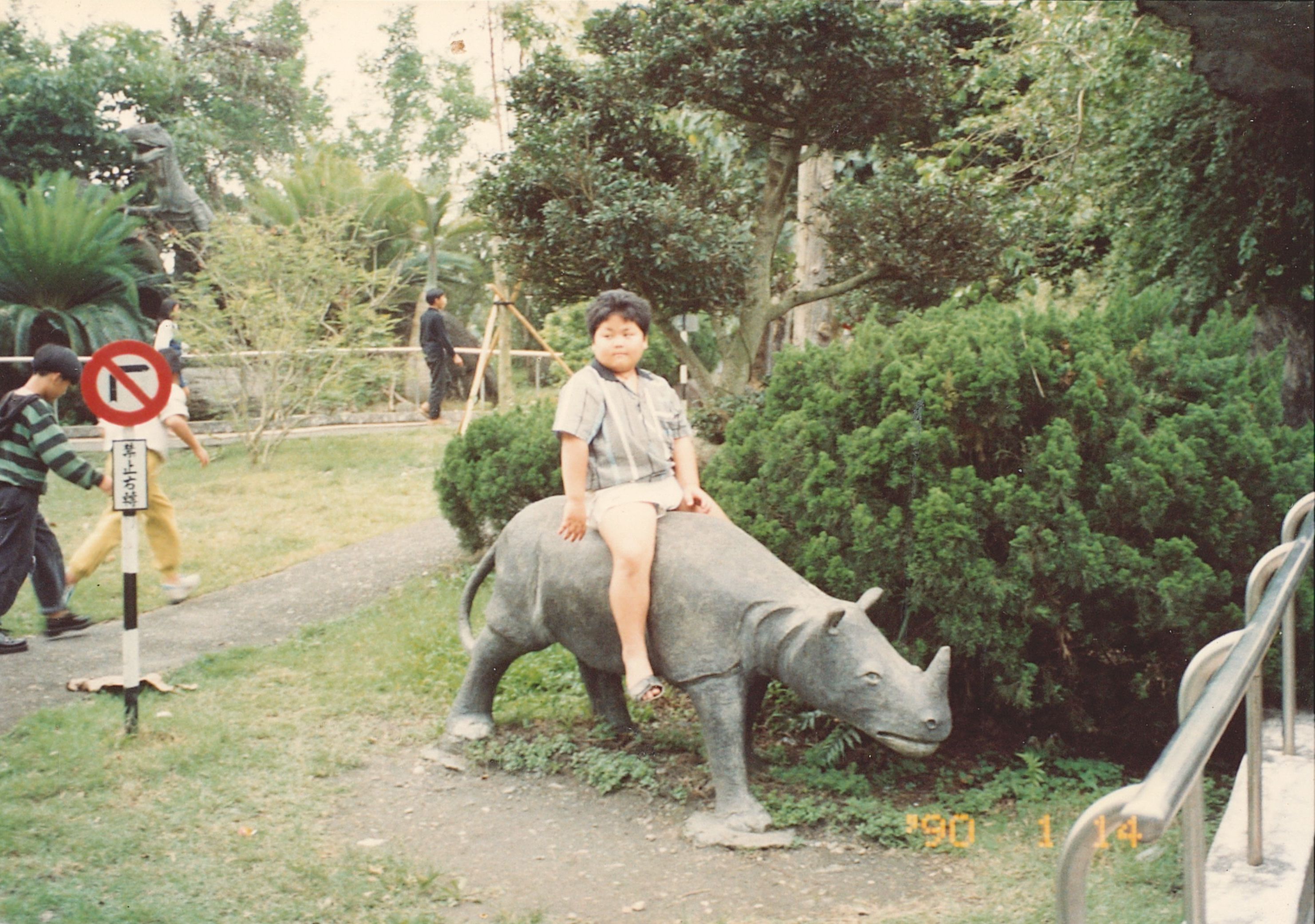 鳳林公路公園出遊照。照片拍攝的時間為1990年1月14日(民國79年),照片提供者為邱美華女士,此為她帶兒子到鳳林公路公園遊玩的照片(即照片中坐在犀牛雕像上的男孩)。鳳林公路公園位在花蓮縣鳳林鄉,完工於1982(民國71年),為設於鳳林溪旁占地長條形約一公頃的休閒公園,因鄰近台九線縱谷公路旁而命名為公路公園,公園內設有座椅、涼亭、各種動物塑像等,1993(民國82年)增設鳳林鎮文物館,陳列早期農村的農耕器具與生活用品。現今遊客數不如以往,但在1980、90年代左右,是台九線遊客南來北往與當地人遊憩的熱鬧場所,也是花蓮在地許多國小學生們遠足的回憶場所,當時還有攤販在此設攤販賣。近年來因為社區營造的關係,鳳林鎮有不少在地協會期望能夠活絡此地,發展市集或其他觀光產業。
