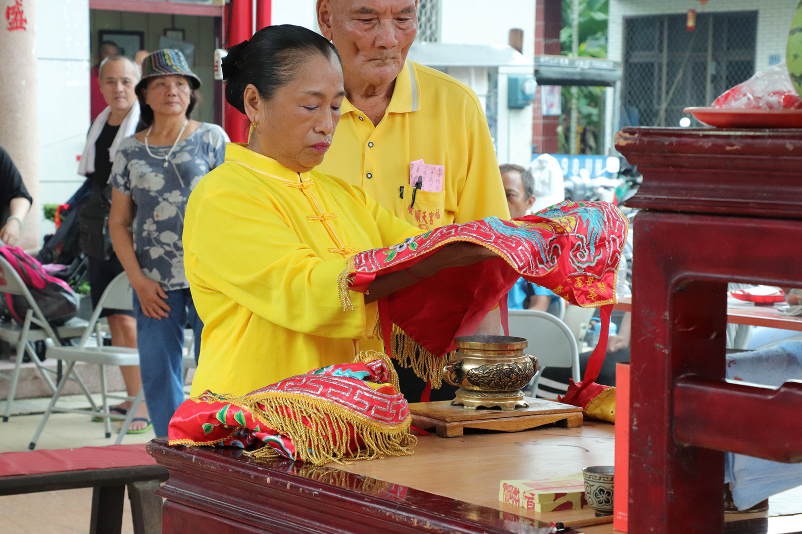 廟公在旁輔助媽祖的乩身,確保起乩步驟幫助她能順利讓媽祖上身,乩身手上的紅布則是要準備在上身前綁在肚子上的神器。