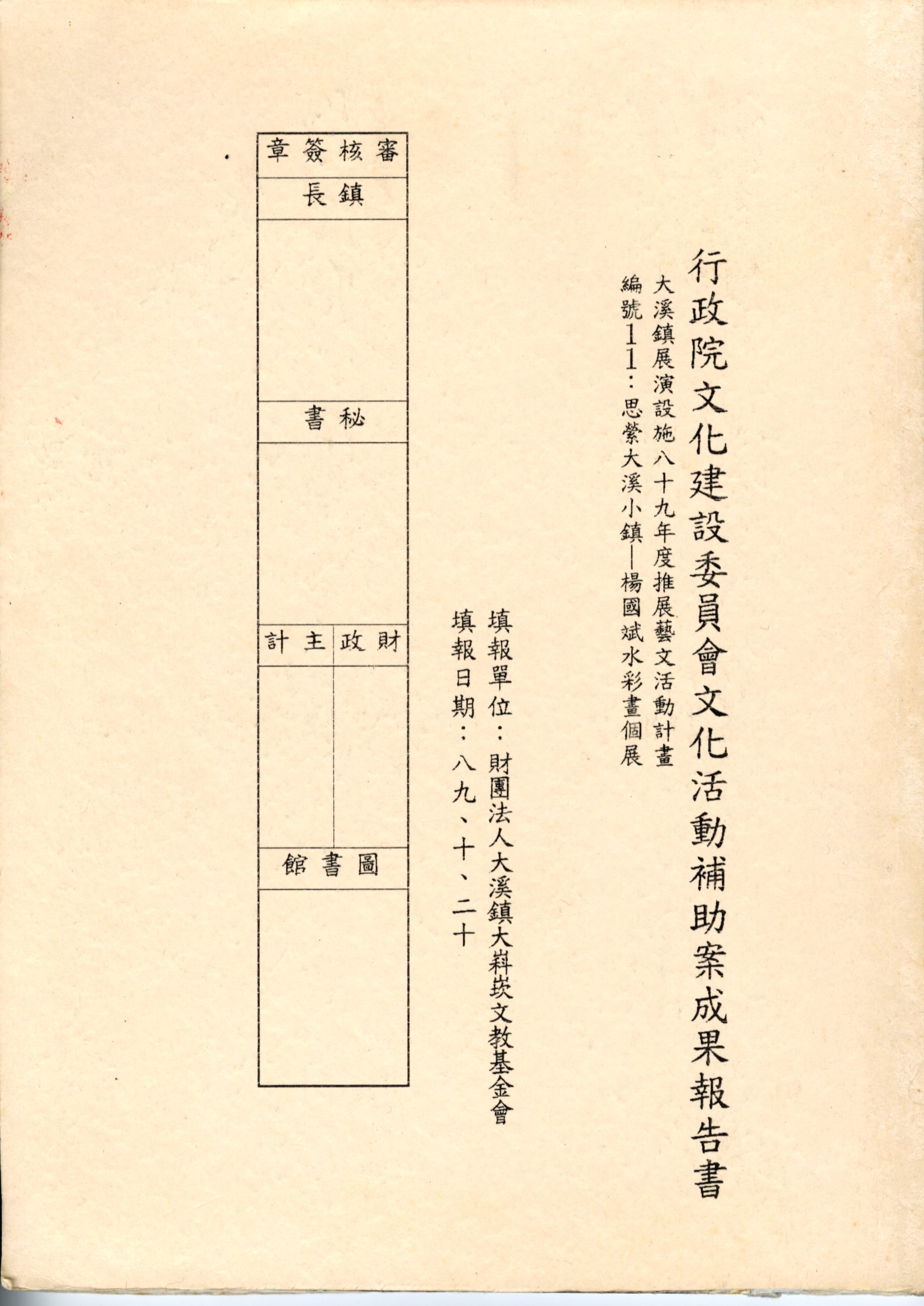 本報告書為大嵙崁文教基金會提報之「行政院文化建設委員會文化活動補助案」成果報告書,內容為「大溪鎮展演設施八十九年度推展藝文活動計畫編號11:思縈大溪小鎮─楊國斌水彩畫個展」。 楊國斌老師及五十三幅作品展出。接受補助經費工作內容包括展出籌備、展場佈置、開幕茶會、文宣品印刷、宣傳、展出服務及活動紀錄等。 楊國斌出生於大溪鎮新南老街,畢業於國立藝專西畫組,專攻水彩、油畫及木雕創作,自復興商工教職退休後,應大溪鎮公所建設課長張清萬之邀,回到故鄉開個人創作工作室專心創作。 大溪鎮展演設施八十九年度推展藝文活動計畫,為財團法人大嵙崁文教基金會主持之計劃,內容涵蓋動態的藝文表演,及藝術創作品展出的靜態展演,主要推廣對象為大溪老城區,乃至整個大溪區的社區居民,目的在加深大溪區居民的藝文素養,自兒童到高齡長者,皆有機會參加大溪的文化盛宴,將大溪塑造為首屈一指的藝文小鎮。