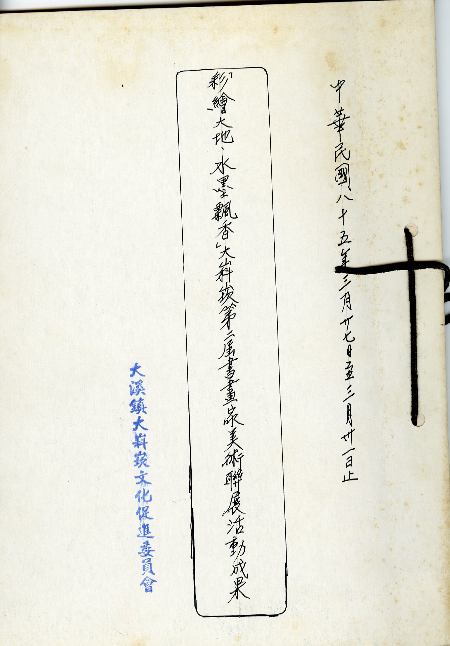 民國85年度「彩繪大地、水墨飄香」大嵙崁第二屆書畫家美術聯展活動,於三月二十七日至三十日舉行。 時任大溪鎮鎮長兼大嵙崁文化促進委員會主任委員林熺達先生,感念大溪過去因河運交通史經貿發達,物產豐富使名氣張揚,人才出眾,留有許多名勝古蹟,基於宣揚祖德,兒孫必昌的道理,籌畫整理大溪過去文物,更肯定大嵙崁的文化光輝。 「彩繪大地、水墨飄香」美術聯展活動,邀請大溪成名的地方人士參展,由「桃園樂有絲竹室內樂團」現場全程伴奏活動,現場還有展出國畫、書法、水彩、油畫、陶藝、茶藝,除了靜態展演之外,還有陶藝拉胚、現場揮毫的體驗活動,展覽期間觀賞民眾踴躍,深獲大家好評。 成果書其中包含作品書法照片4張、水彩照片4張、油畫照片4張、陶藝照片4張、現場揮毫照片6張、其餘為現場活動照片。照片顯示現場民眾頗為踴躍參與體驗活動,不乏有親子互動的場景。