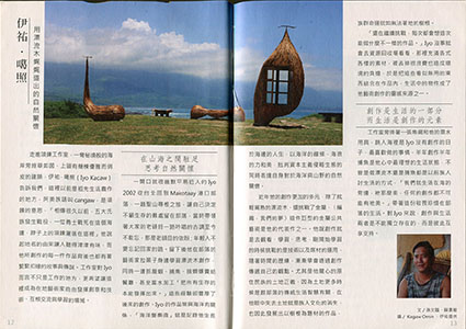 伊祐˙噶照(Iyo Kacaw),因為一趟聖山尋根之旅,西元2002年從臺北回到Makotaay港口部落,留下來一邊和部落藝術家拉黑子學習漂流木創作,一邊抓龍蝦、捕魚、撿蠑螺賣給餐廳,也曾當過水泥工,這些經驗成為他日後創作的能量來源。Iyo的作品常與海洋有關係,「海洋變奏曲」就是記錄他在海邊的人生,以海洋的線條,海浪的力和美,批判資本主義侵略生態的現象,同時表達對於大山大海的自然關懷。近年來他的創作更加多元,除了漂流木,金屬也成為創作媒材之一,同時漸漸將自己的觀點融入於作品中傳達出去。