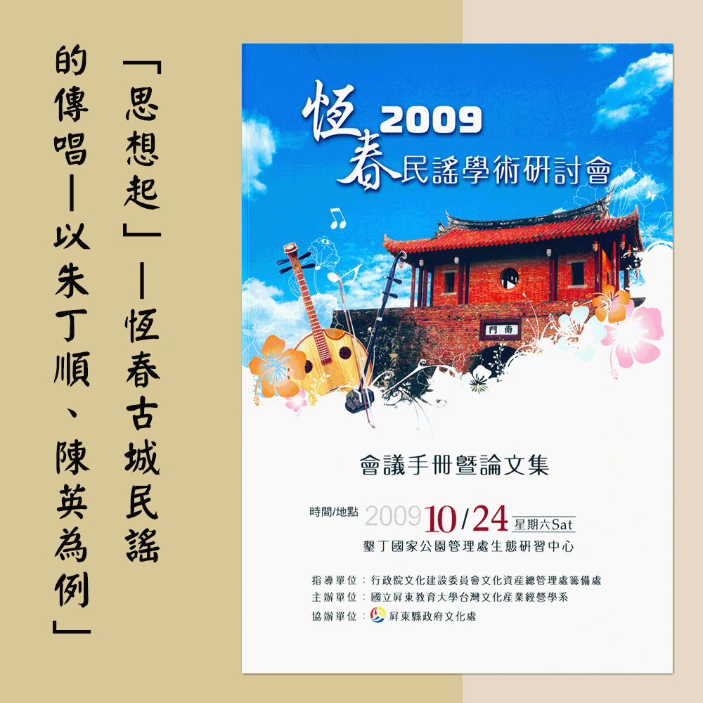此篇研討會論文是作者透過文獻蒐集,加上親自學習民謠傳唱的過程中,採集一手資料而來,文中除了記錄兩位恆春民謠傳藝師朱丁順、陳英的生命故事、歌曲詮釋的內容,也藉由理論分析兩位在演唱〈思想枝〉歌詞結構與音樂曲調的異同。朱丁順與陳英兩位民間樂人對於〈思想枝〉的詮釋,共同特色包含歌詞平仄與用韻較彈性、每句七字的歌詞多以4+3為架構,且皆以福佬語詮釋歌曲,而由於福佬語是一種聲調性語言,因此歌曲旋律會隨著語言聲調的不同而有所差異。而兩人的差異在於搭配月琴彈奏後的旋律模式有所不同、定弦音程分別為5度音與4度音,以及「恆春」兩字透過有無加入襯字、重音落在不同字上所產生的聽覺感受。