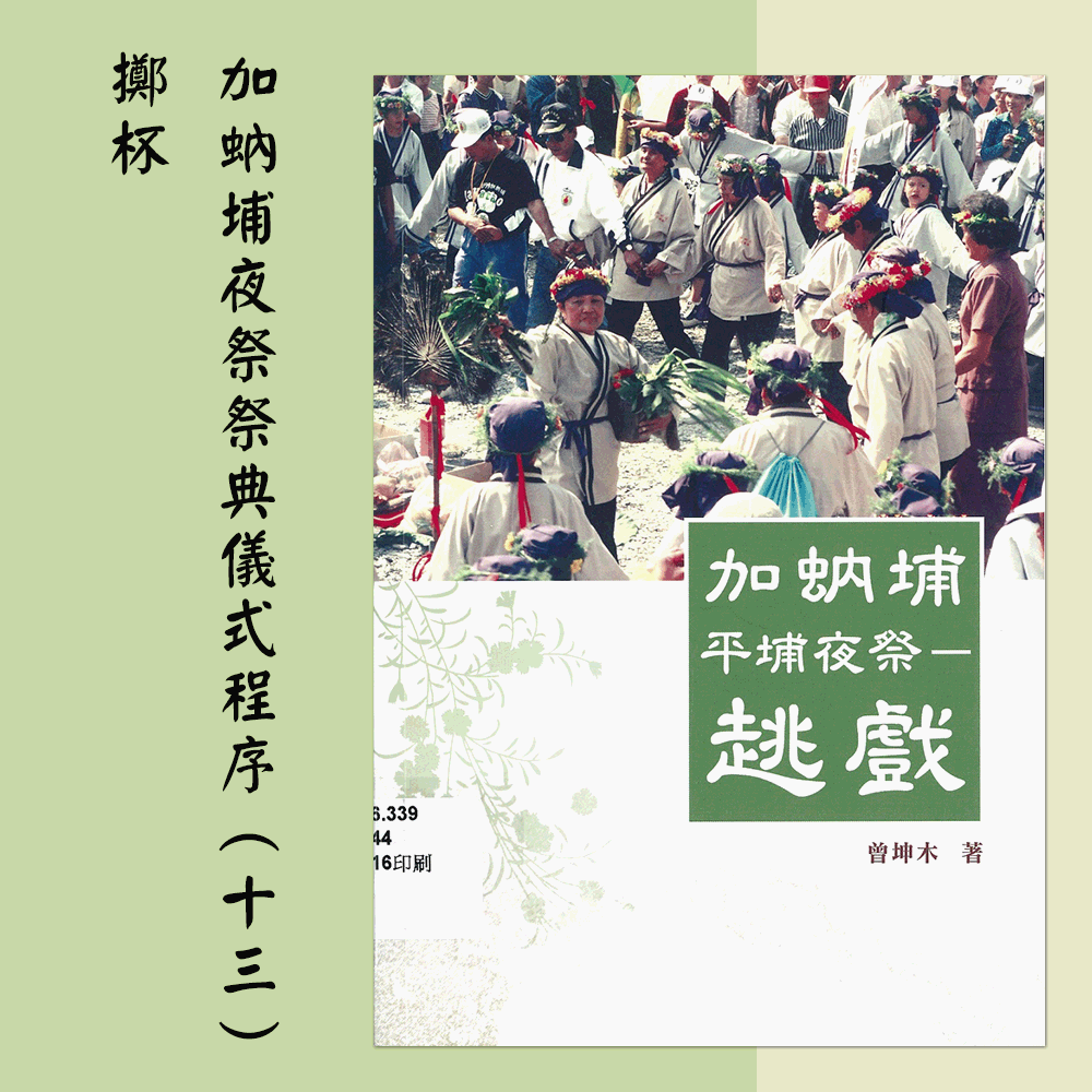 《加蚋埔平埔夜祭-趒戲》一書敘述有關加蚋埔平埔夜祭儀式中的「擲杯」程序,對阿姆祖上香完畢,尪姨及長老率領信眾,由爐主或長老持筊請示阿姆祖是否滿意今晚的獻祭,如若滿意,就在眾人見證下以聖杯(一正一反,一陽一陰)顯示。