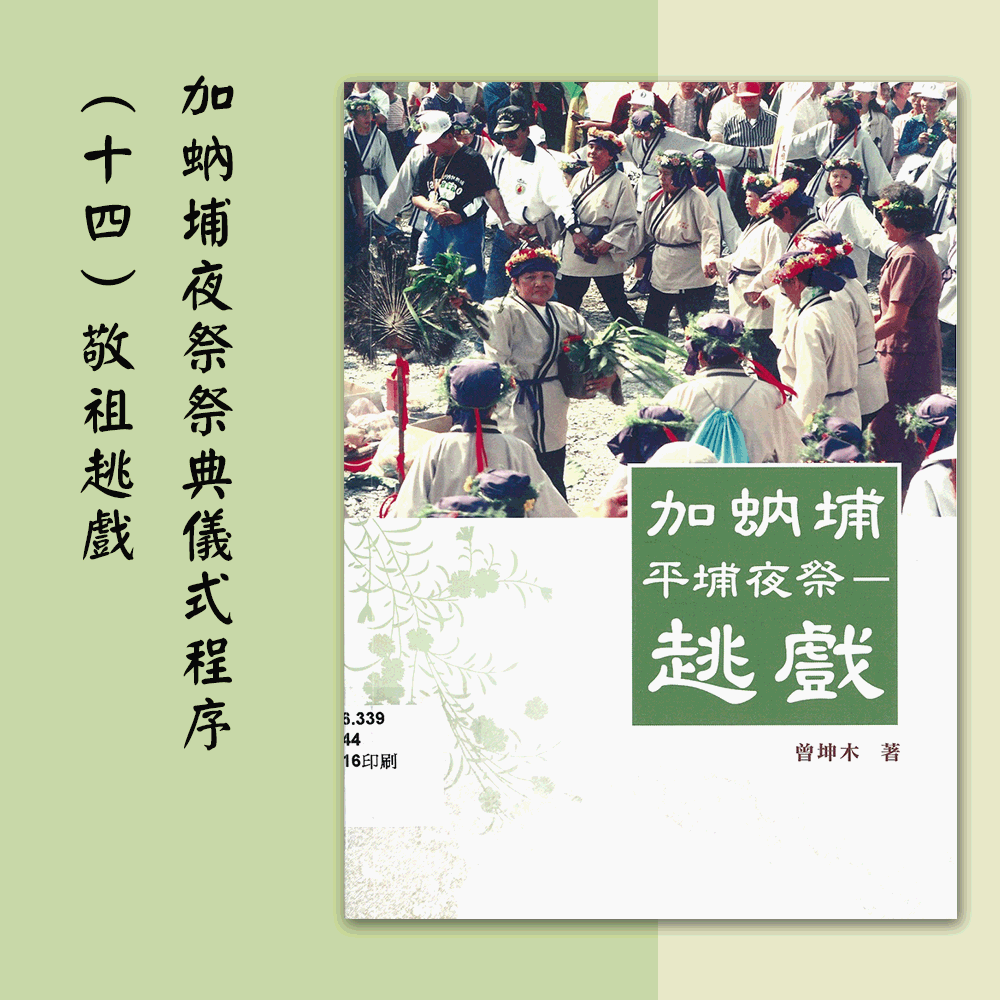 《加蚋埔平埔夜祭-趒戲》一書敘述有關加蚋埔平埔夜祭儀式中的「敬祖趒戲」程序,經過前面一連串的祭典科儀後,時間已是近半夜子時,尪姨率領所有會唱牽曲的族民,眾人於公廨前刺桐樹下手牽手圍成圓圈,在尪姨帶領之下起頭吟唱古老的祭祖曲調,現今約有五六首流傳祭典的歌謠,由眾人輪唱、合唱,直至接近半夜凌晨才結束。次日上午亦有趒戲,男女皆可參加,性質類似歡樂的團員慶典,中午則有敬老午宴以及做給神明看的布偶香戲。
