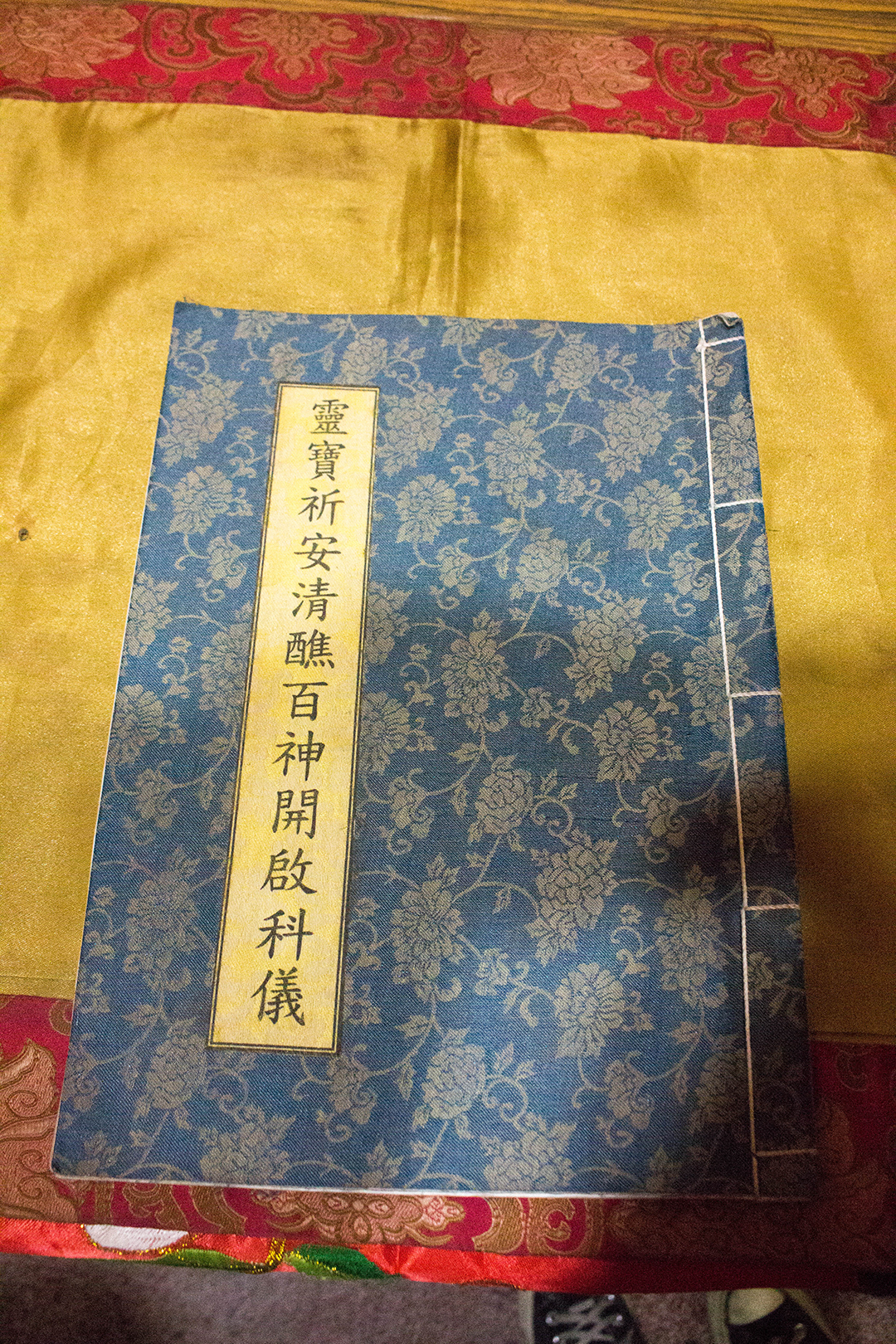 這組照片拍攝於2019年7月19日,共有4張照片。地點位在屏東縣東港鎮大潭路17號大潭保安宮內。靈寶祈安清醮百神開啟科儀、靈寶水火二部請王安座祝聖科儀是在大潭迎王王船法會儀式上會使用到的2本經書。其中靈寶祈安清醮百神開啟科儀在大潭迎王的請王活動中也可以看見它的身影。道士在王船法會儀式中會將這2本經書及祭典人員的名單皆朗誦過一遍才會進行下一項儀式。靈寶祈安清醮百神開啟科儀的外觀為深藍色帶著多朵由不同角度繪製而成的灰黃色花卉,使其散發出一種帶有古時風味卻又不落入俗套的美感。而靈寶水火二部請王安座祝聖科儀的外觀則是由黃色搭配多朵由不同角度繪製而成的淡黃色花卉,在視覺上營造出與對稱的效果。