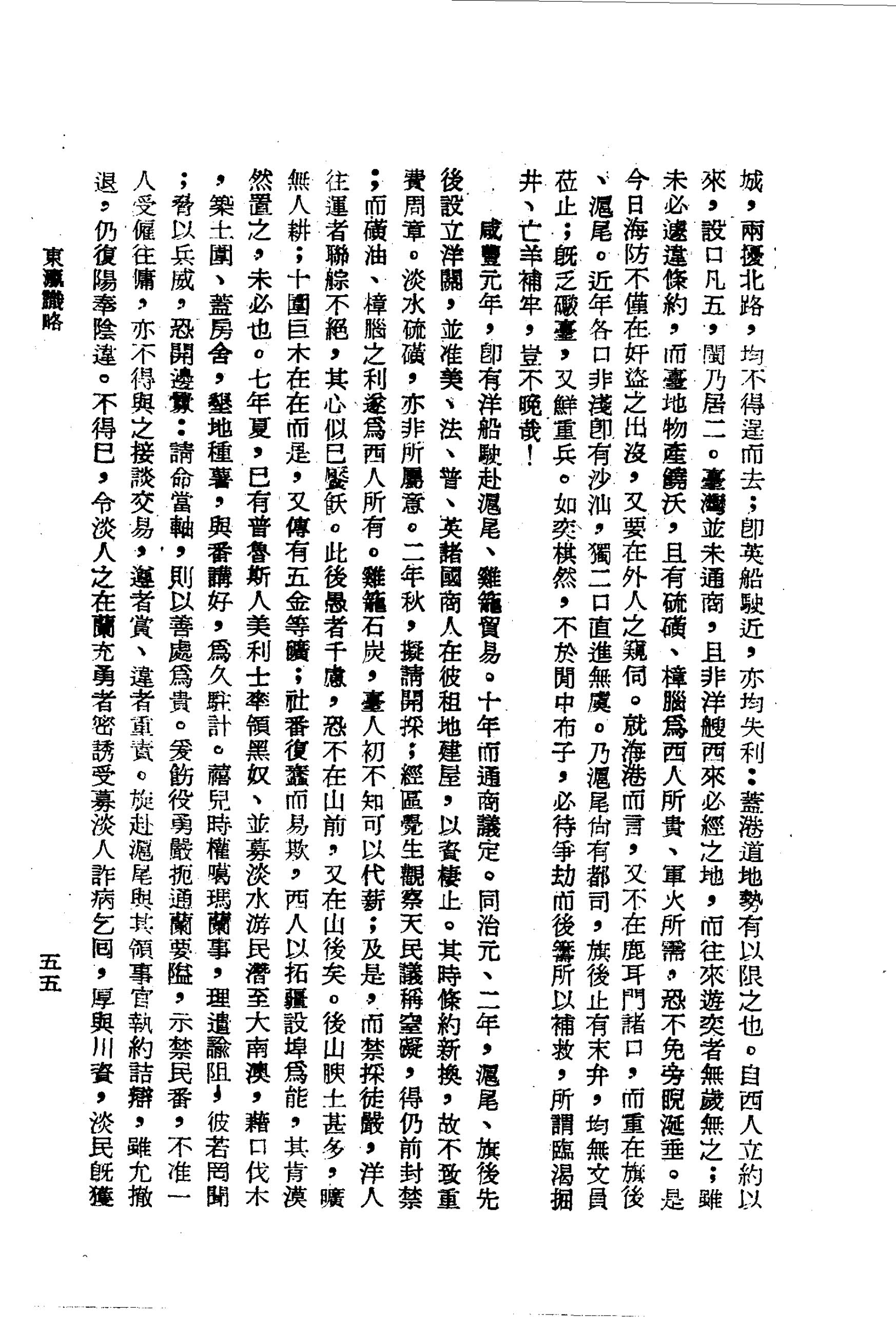 臺灣並未通商,且非洋艘西來必經之地,而往來遊奕者無歲無之;雖未必遽違條約,而臺地物產饒沃,且有硫磺、樟腦為西人所貴、軍火所需,恐不免旁睨涎垂。