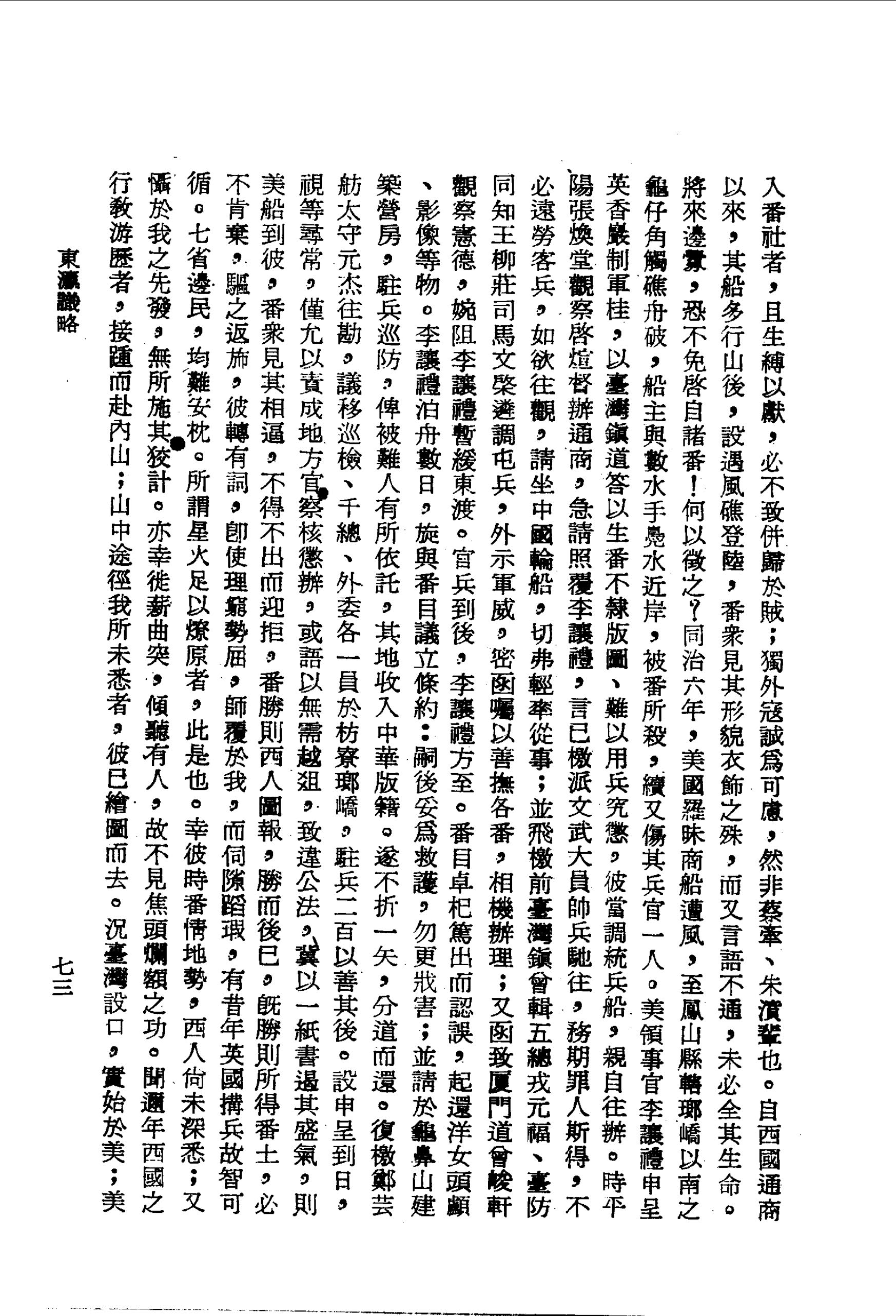 聞邇年西國之行教游歷者,接踵而赴內山;山中途徑我所未悉者,彼已繪圖而去。況臺灣設口,實始於美;美之所貴,首在樟腦,他國不重也。苟有罅隙可乘,條約足恃乎哉!