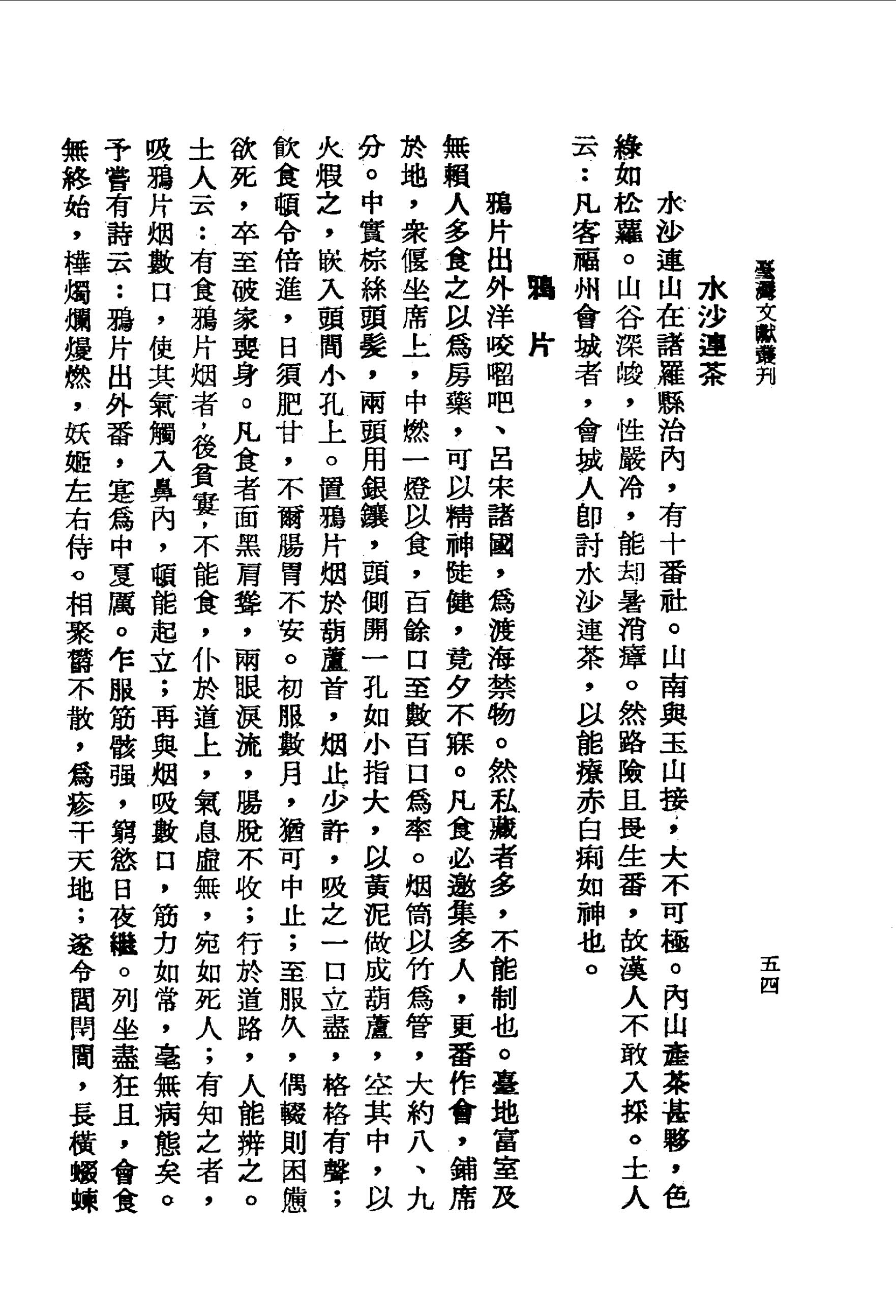水沙連山在諸羅縣治內,有十番社。山南與玉山接,大不可極。內山產茶甚夥,色綠如松蘿。山谷深峻,性嚴冷,能卻暑消瘴。然路險且畏生番,故漢人不敢入採。土人云:凡客福州會城者,會城人即討水沙連茶,以能療赤白痢如神也。