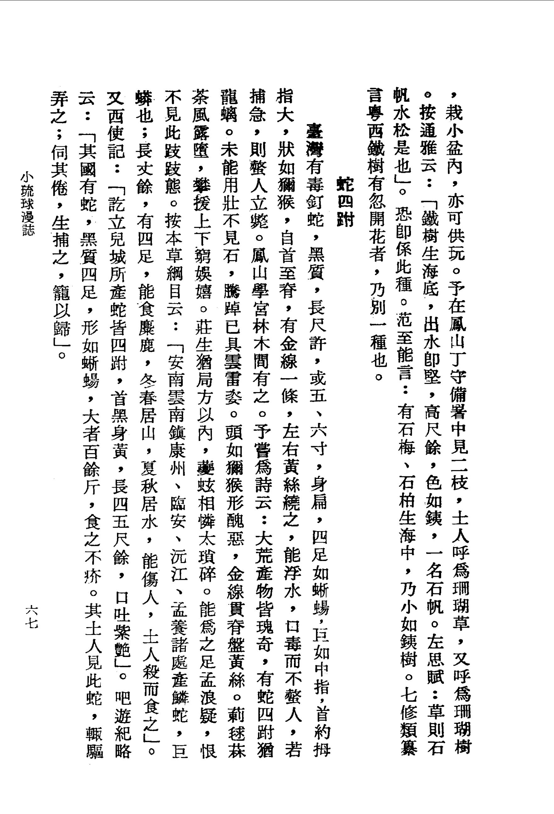 臺灣有毒釘蛇,黑質,長尺許,或五、六寸,身扁,四足如蜥蜴,巨如中指,首約拇指大,狀如獮猴,自首至脊,有金線一條,左右黃絲繞之,能浮水,口毒而不螫人,若捕急,則螫人立斃。