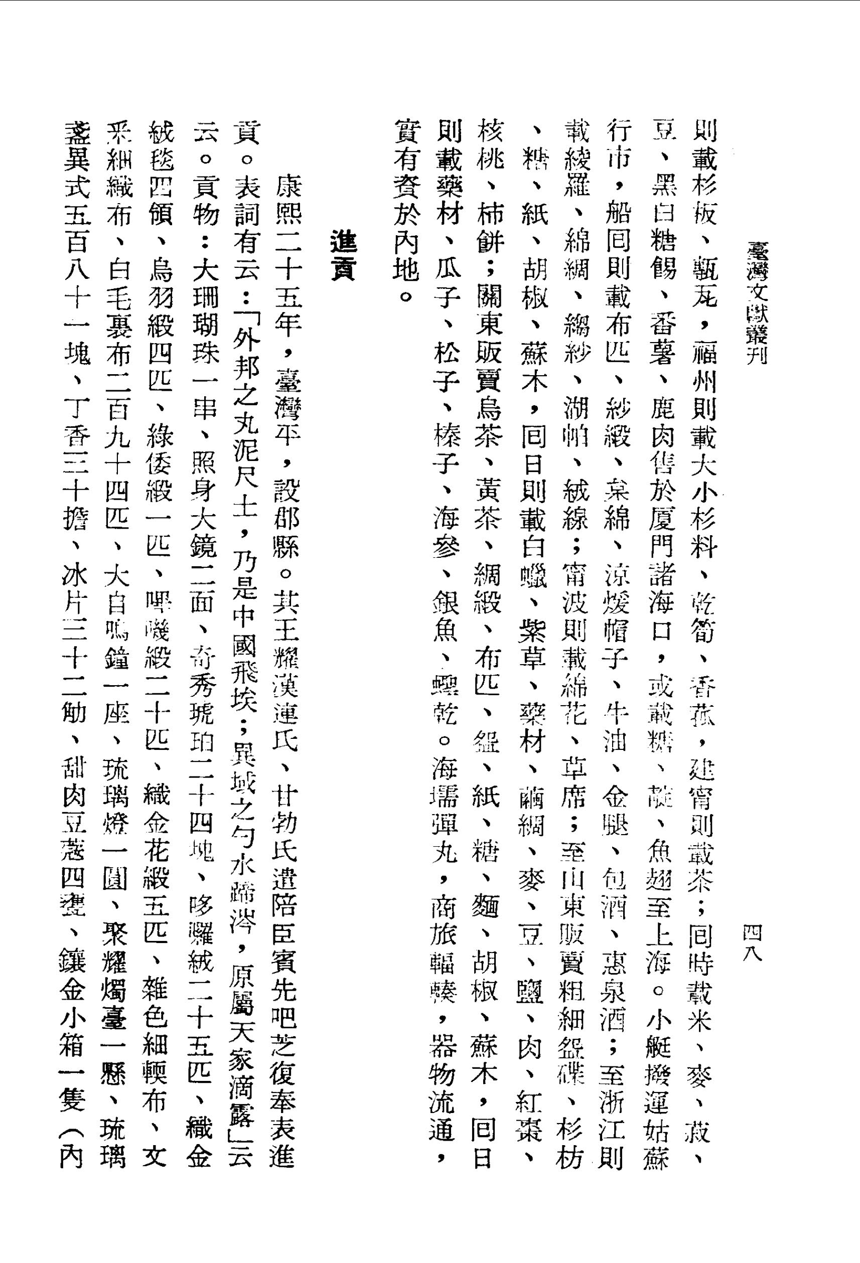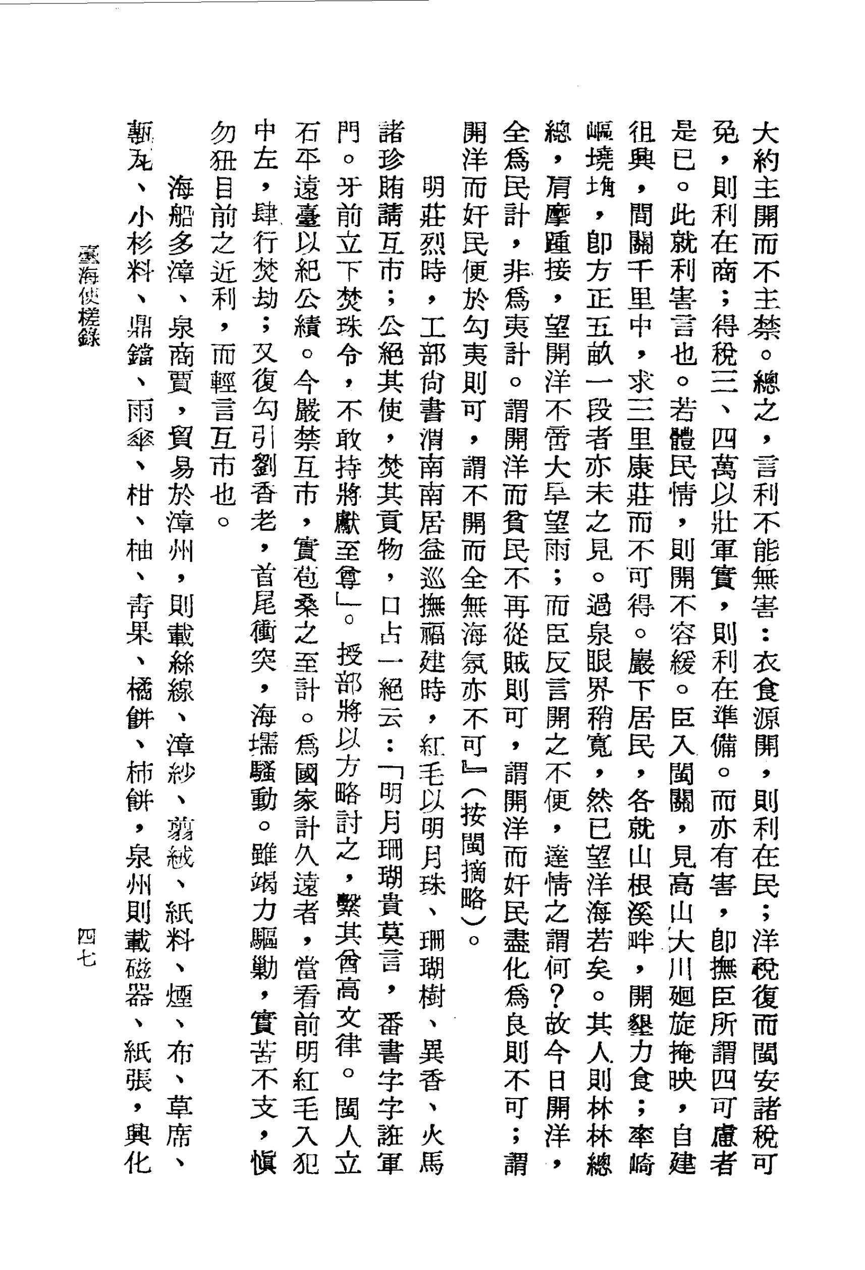 海船多漳、泉商賈,貿易於漳州,則載絲線、漳紗、翦絨、紙料、煙、布、草席、甎瓦、小杉料、鼎鐺、雨傘、柑、柚、青果、橘餅、柿餅,泉州則載磁器、紙張,興化則載杉板、甎瓦,福州則載大小杉料、乾筍、香菰,建甯則載茶;回時載米、麥、菽、豆、黑白糖□、番薯、鹿肉售於廈門諸海口,或載糖、靛、魚翅至上海。小艇撥運姑蘇行市,船回則載布匹、紗緞、枲綿、涼煖帽子、牛油、金腿、包酒、惠泉酒;至浙江則載綾羅、綿綢、縐紗、湖帕、絨線;甯波則載綿花、草席;至山東販賣粗細盌碟、杉枋、糖、紙、胡椒、蘇木,回日則載白蠟、紫草、藥材、繭綢、麥、豆、鹽、肉、紅棗、核桃、柿餅;關東販賣烏茶、黃茶、綢緞、布匹、盌、紙、糖、麵、胡椒、蘇木,回日則載藥材、瓜子、松子、榛子、海參、銀魚、蟶乾。海壖彈丸,商旅輻輳,器物流通,實有資於內地。
