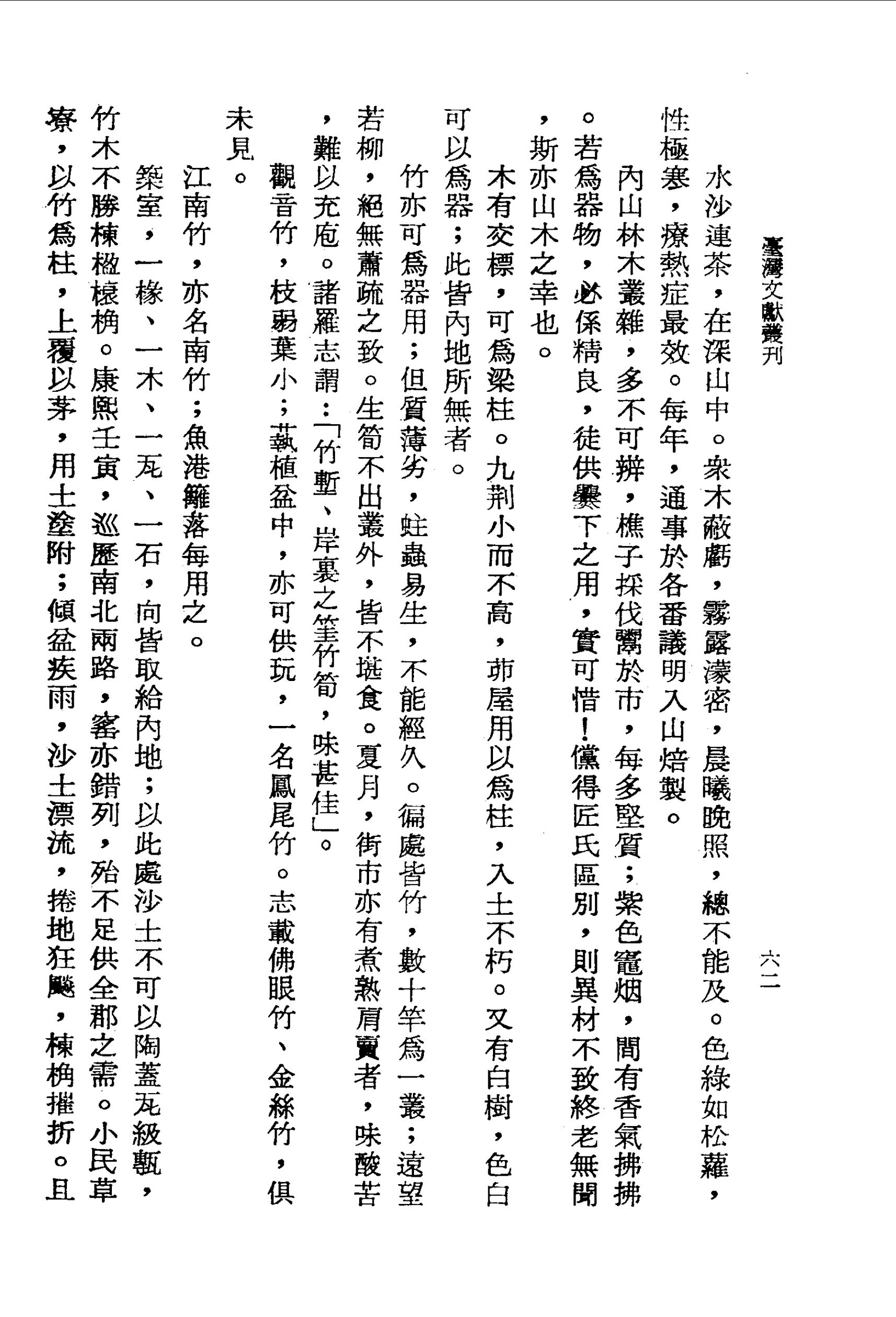 水沙連茶,在深山中。眾木蔽虧,霧露濛密,晨曦晚照,總不能及。色綠如松蘿,性極寒,療熱症最效。每年,通事於各番議明入山焙製。