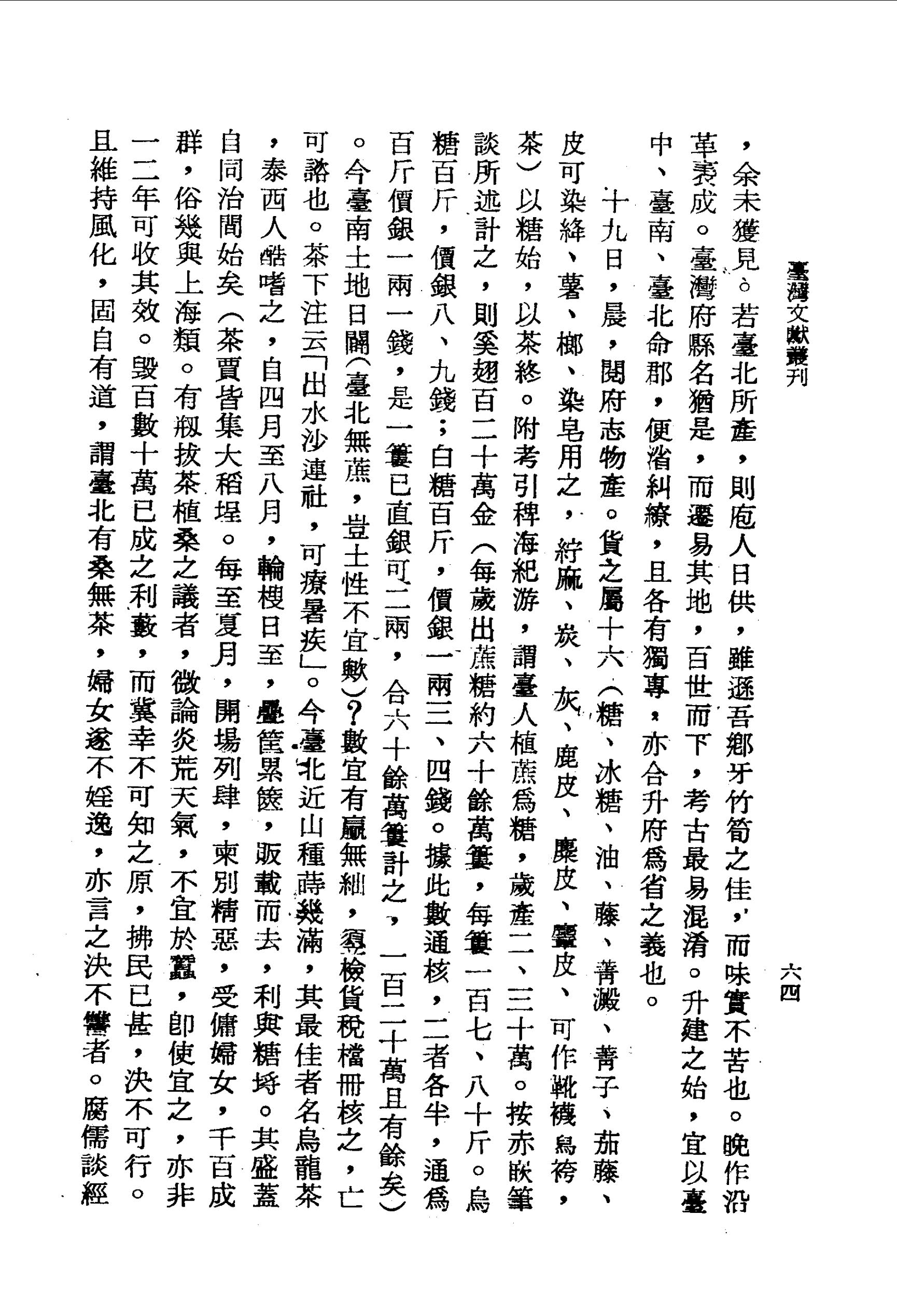 茶下注云「出水沙連社,可療暑疾」。今臺北近山種蒔幾滿,其最佳者名烏龍茶,泰西人酷嗜之,自四月至八月,輪□日至,疊筐累篋,販載而去,利與糖埒。