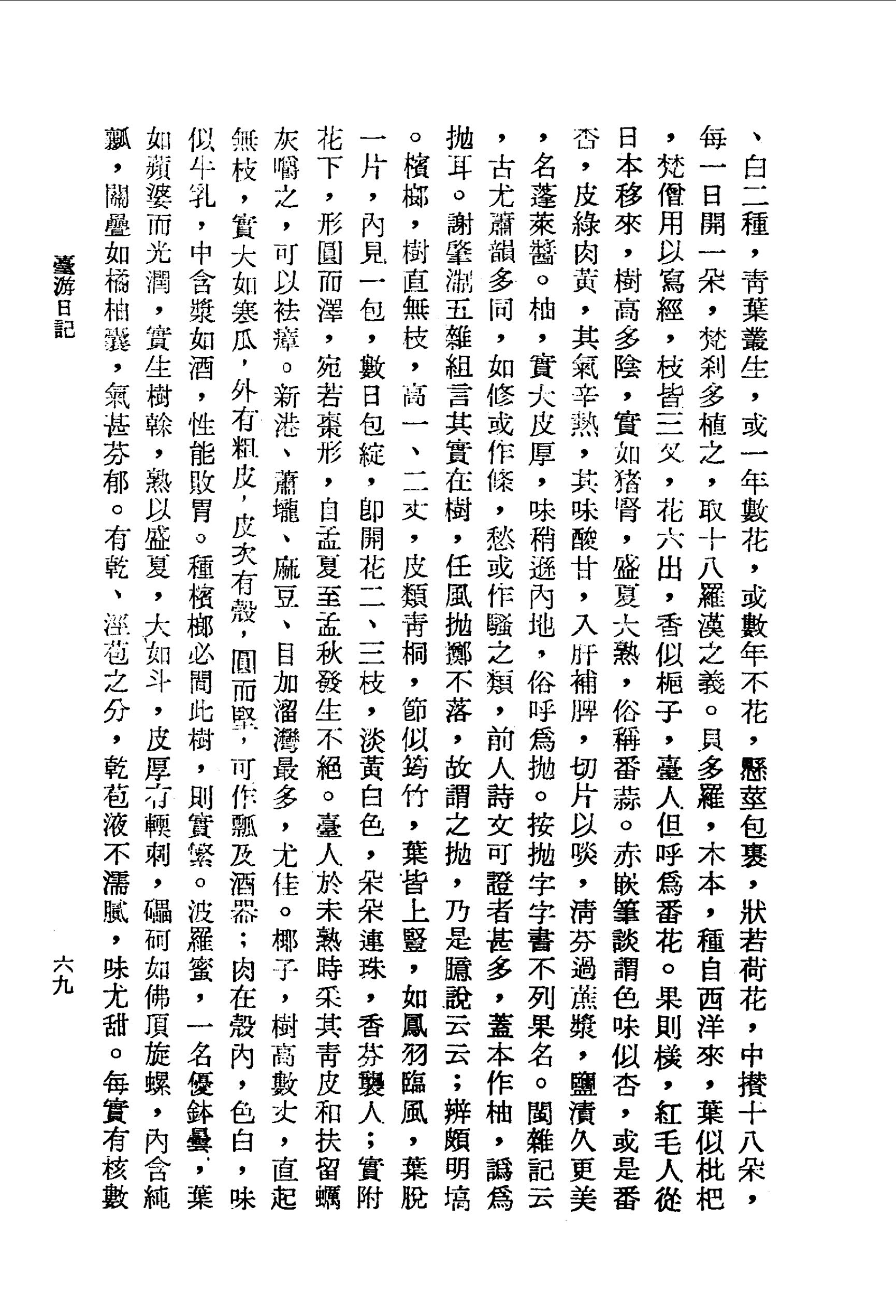 檳榔,樹直無枝,高一、二丈,皮類青桐,節似筠竹,葉皆上豎,如鳳羽臨風,葉脫一片,內見一包,數日包綻,即開花二、三枝,淡黃白色,朵朵連珠,香芬襲人;實附花下,形圓而澤,宛若棗形,自孟夏至孟秋發生不絕。臺人於未熟時采其青皮和扶留蠣灰嚼之,可以袪瘴。新港、蕭壠、麻豆、目加溜灣最多,尤佳。