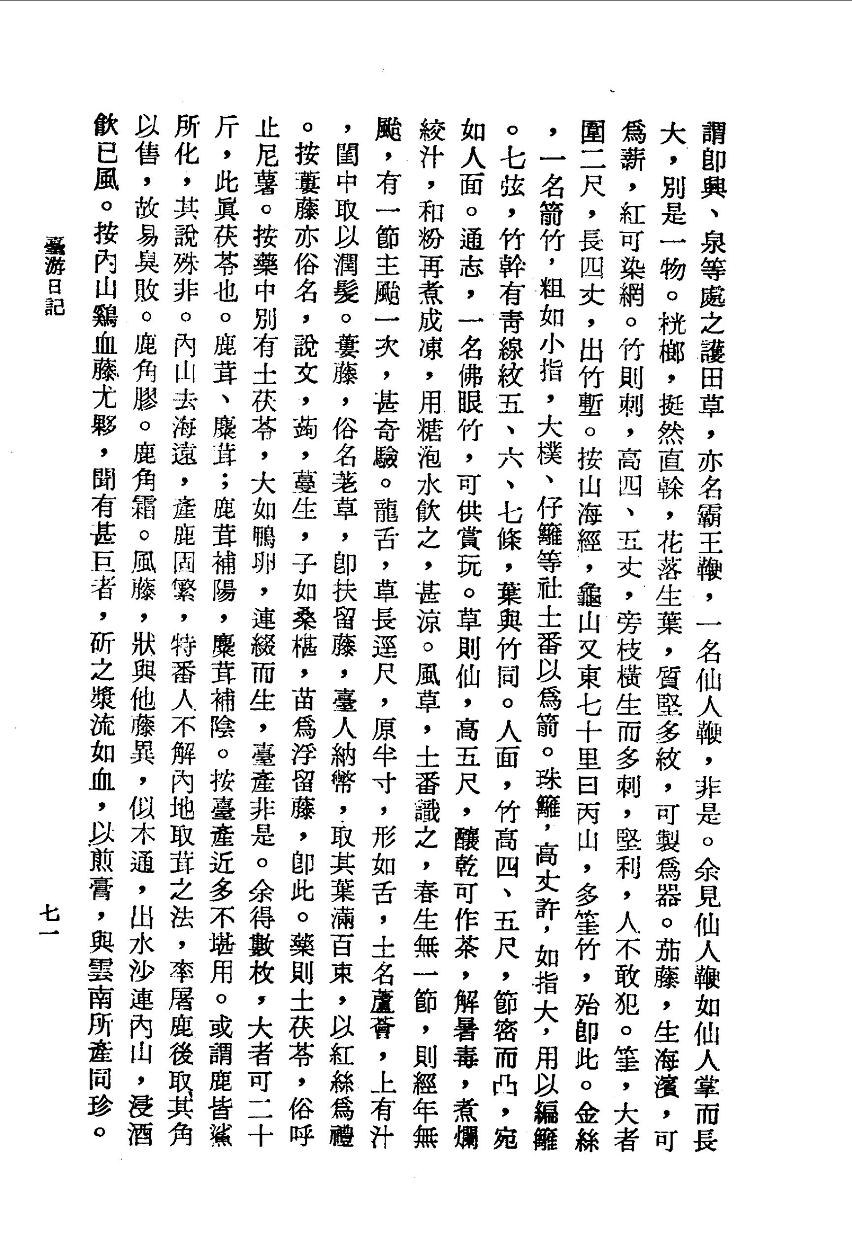 風藤,狀與他藤異,似木通,出水沙連內山,浸酒飲已風。按內山雞血藤尤夥,聞有甚巨者,斫之漿流如血,以煎膏,與雲南所產同珍。