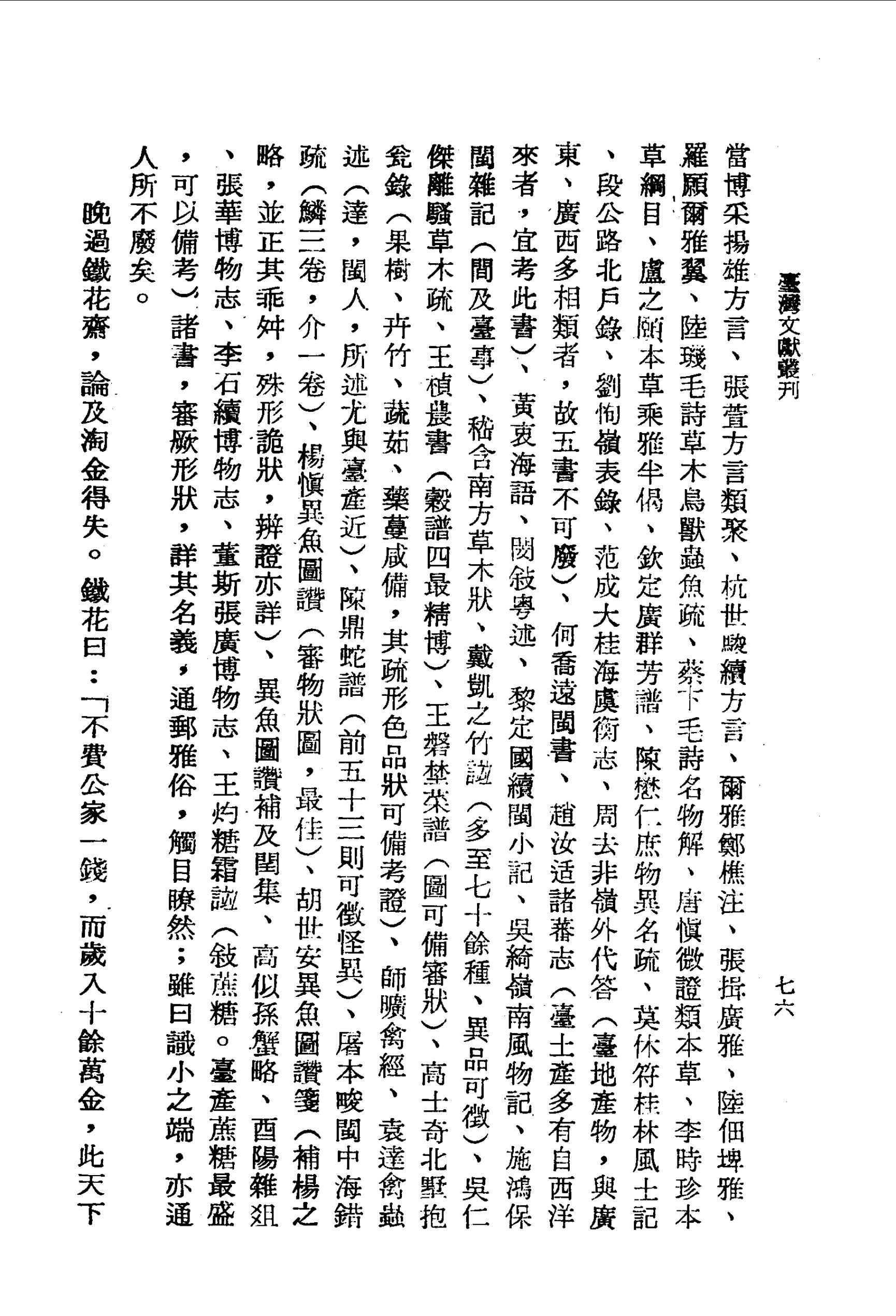 撰考時當博采揚雄方言、張萱方言類聚、杭世駿續方言、爾雅鄭樵注、張揖廣雅、陸佃埤雅、羅願爾雅翼、陸璣毛詩草木鳥獸蟲魚疏、蔡卞毛詩名物解、唐慎微證類本草、李時珍本草綱目、盧之頤本草乘雅半偈、欽定廣群芳譜、陳懋仁庶物異名疏、莫休符桂林風土記、段公路北戶錄、劉恂嶺表錄、范成大桂海虞衡志、周去非嶺外代答(臺地產物,與廣東、廣西多相類者,故五書不可廢)、何喬遠閩書、趙汝适諸蕃志(臺土產多有自西洋來者,宜考此書)、黃衷海語、閔敘粵述、黎定國續閩小記、吳綺嶺南風物記、施鴻保閩雜記(間及臺事)、嵇含南方草木狀、戴凱之竹□(多至七十餘種、異品可徵)、吳仁傑離騷草木疏、王楨農書(穀譜四最精博)、王磐埜菜譜(圖可備審狀)、高士奇北墅抱瓮錄(果樹、卉竹、蔬茹、藥蔓咸備,其疏形色品狀可備考證) 高士奇北墅抱瓮錄(果樹、卉竹、蔬茹、藥蔓咸備,其疏形色品狀可備考證)
