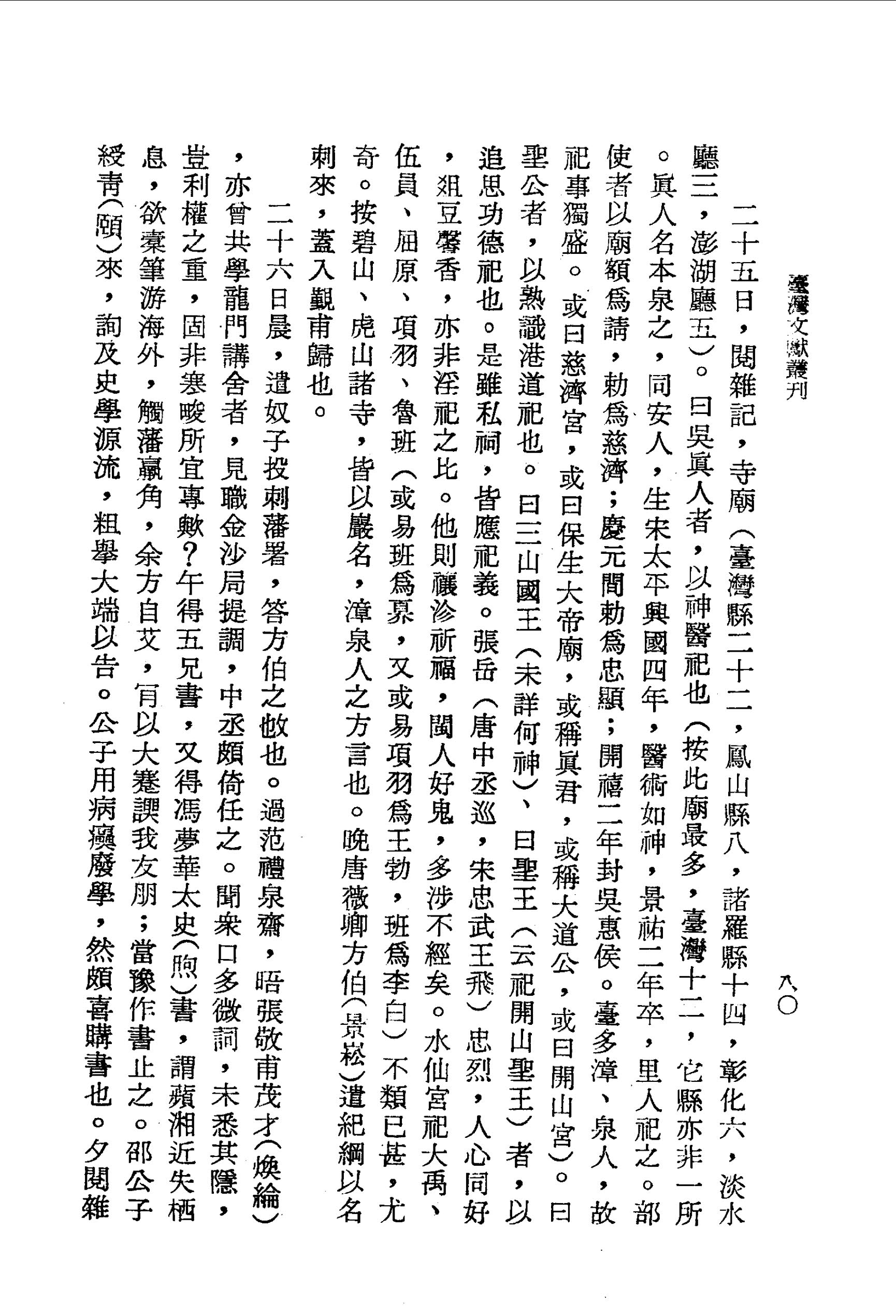 曰吳真人者,以神醫祀也(按此廟最多,臺灣十二,它縣亦非一所。真人名本泉之,同安人,生宋太平興國四年,醫術如神,景祐二年卒,里人祀之。部使者以廟額為請,勅為慈濟;慶元間勅為忠顯;開禧二年封吳惠侯。臺多漳、泉人,故祀事獨盛。或曰慈濟宮,或曰保生大帝廟,或稱真君,或稱大道公,或曰開山宮)。