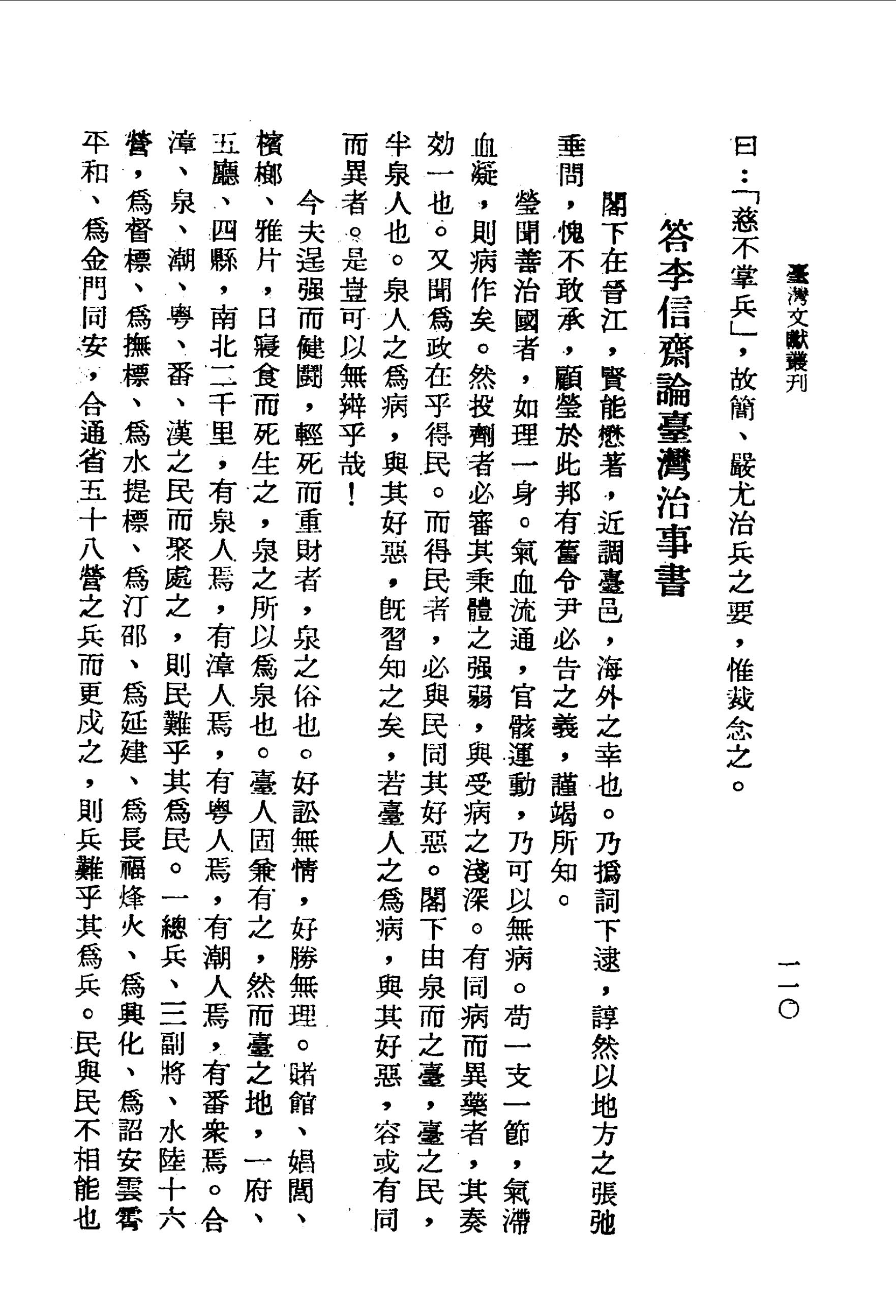 瑩聞善治國者,如理一身。氣血流通,官骸運動,乃可以無病。苟一支一節,氣滯血凝,則病作矣。然投劑者必審其秉體之強弱,與受病之淺深。有同病而異藥者,其奏效一也。又聞為政在乎得民。而得民者,必與民同其好惡。閣下由泉而之臺,臺之民,半泉人也。泉人之為病,與其好惡,既習知之矣,若臺人之為病,與其好惡,容或有同而異者。是豈可以無辨乎哉!