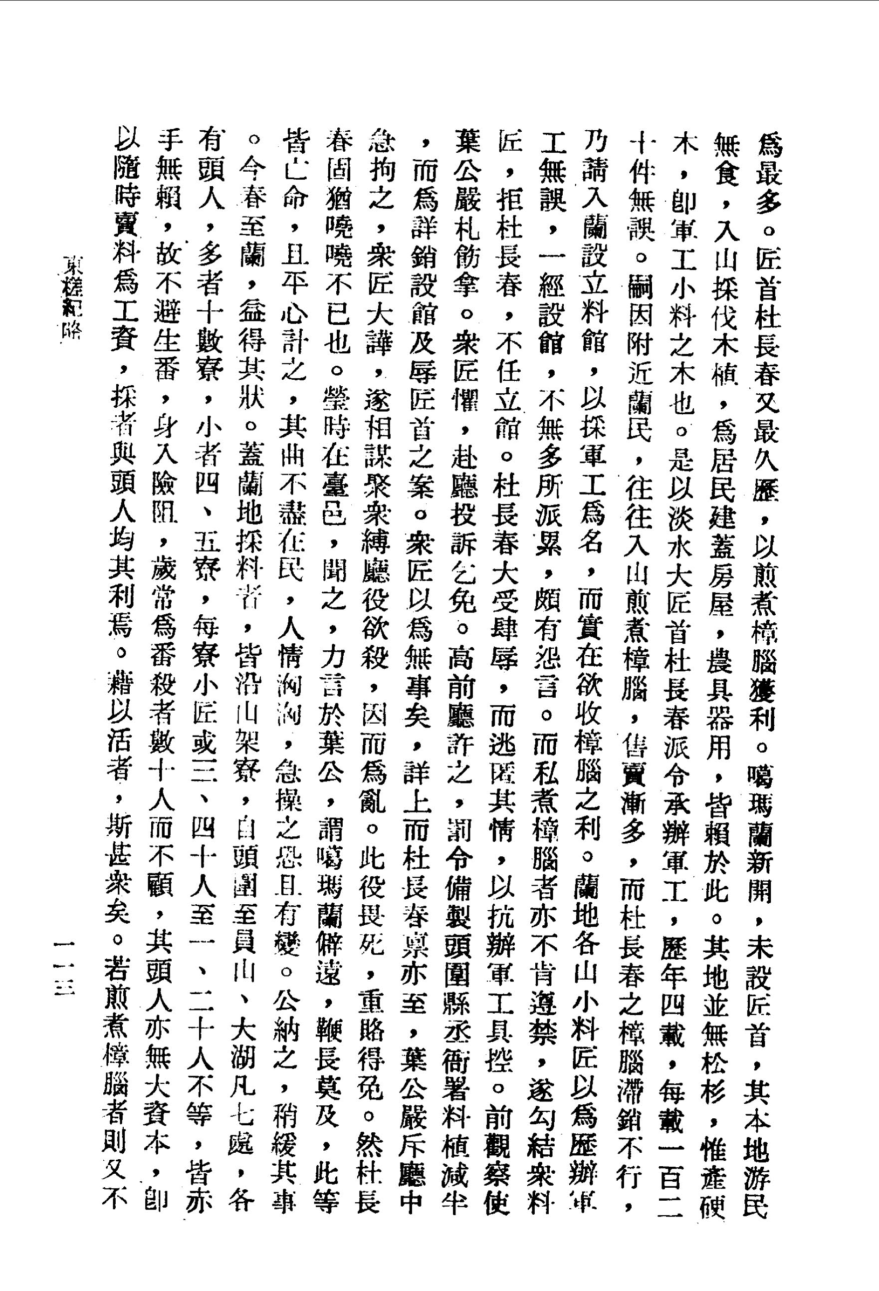 蓋蘭地採料者,皆沿山架寮,自頭圍至員山、大湖凡七處,各有頭人,多者十數寮,小者四、五寮,每寮小匠或三、四十人至一、二十人不等,皆赤手無賴,故不避生番,身入險阻,歲常為番殺者數十人而不顧,其頭人亦無大資本,即以隨時賣料為工資,採者與頭人均其利焉。藉以活者,斯甚眾矣。若煎煮樟腦者則又不然,蓋亦略有身家,而出資鳩工牟利矣。此二者本不相涉,因煎腦者為杜長春病,欲并之而不可,則思除之,迫而與採料者合,乃并採料者亦病之矣。