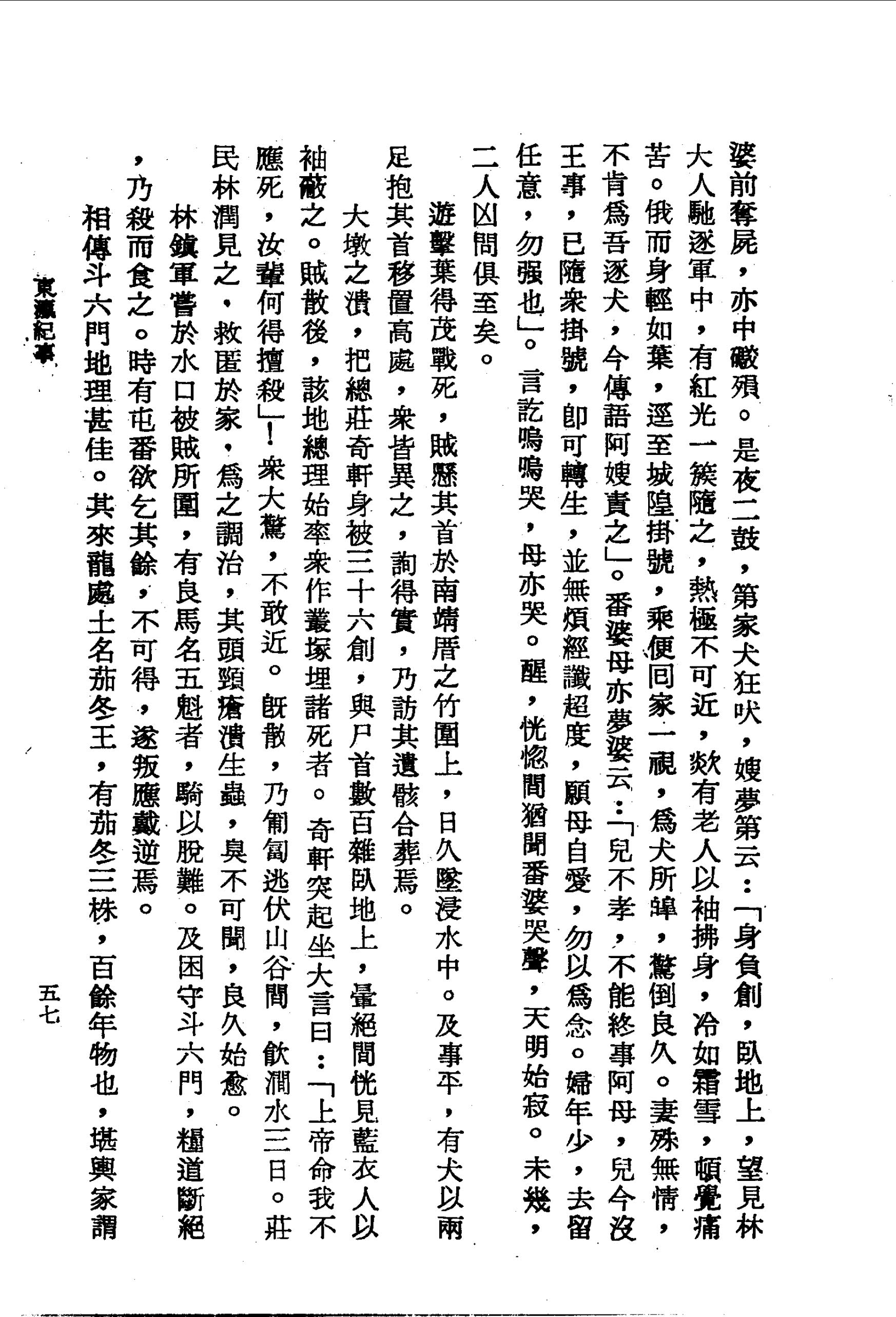 眾大驚,不敢近。既散,乃匍匐逃伏山谷間,飲澗水三日。莊民林潤見之,救匿於家,為之調治,其頭頸瘡潰生蟲,臭不可聞,良久始愈。