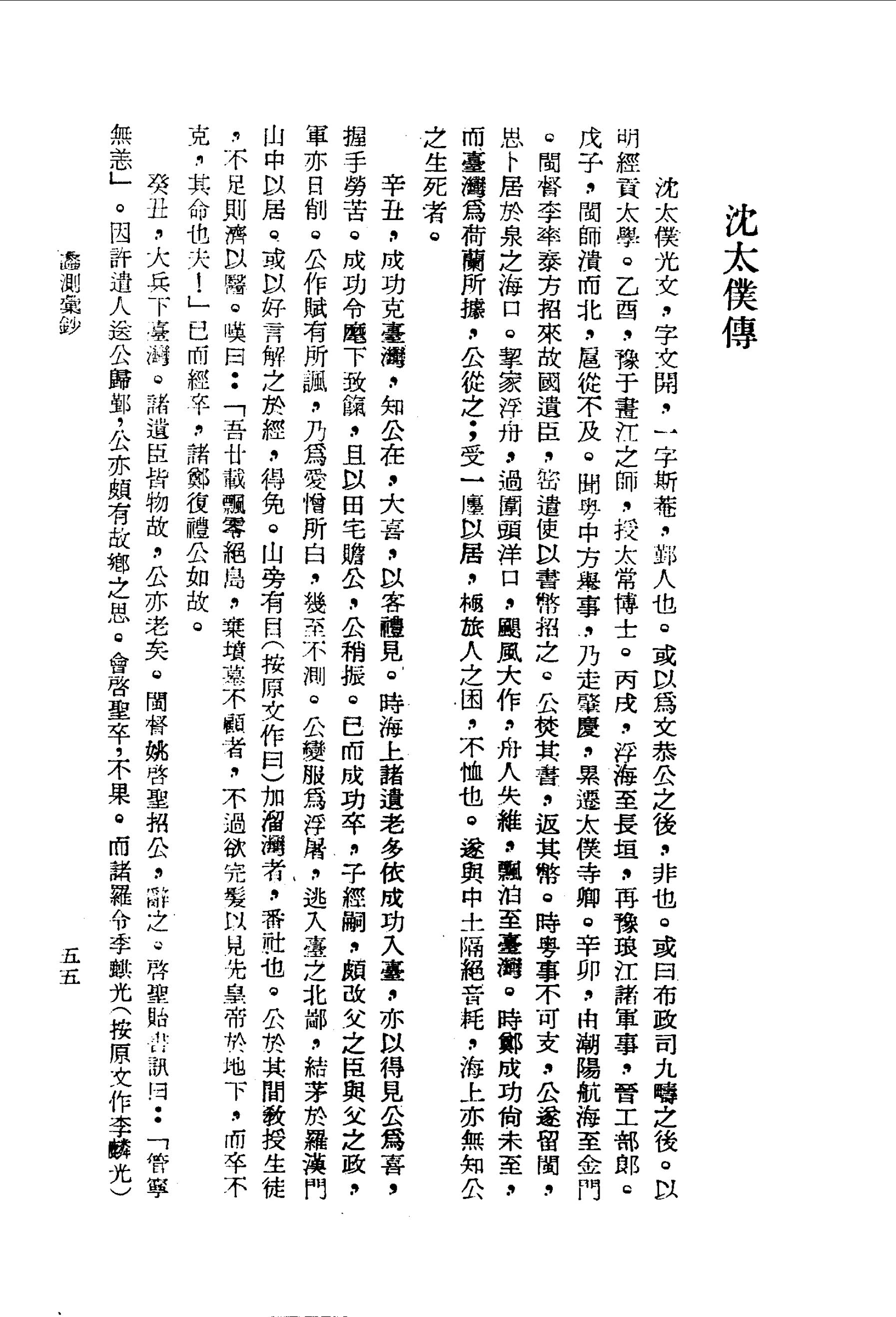 公變服為浮屠,逃入臺之北鄙,結茅於羅漢門山中以居。或以好言解之於經,得免。山旁有目(按原文作曰)加溜灣者,番社也。公於其間教授生徒,不足則濟以醫。