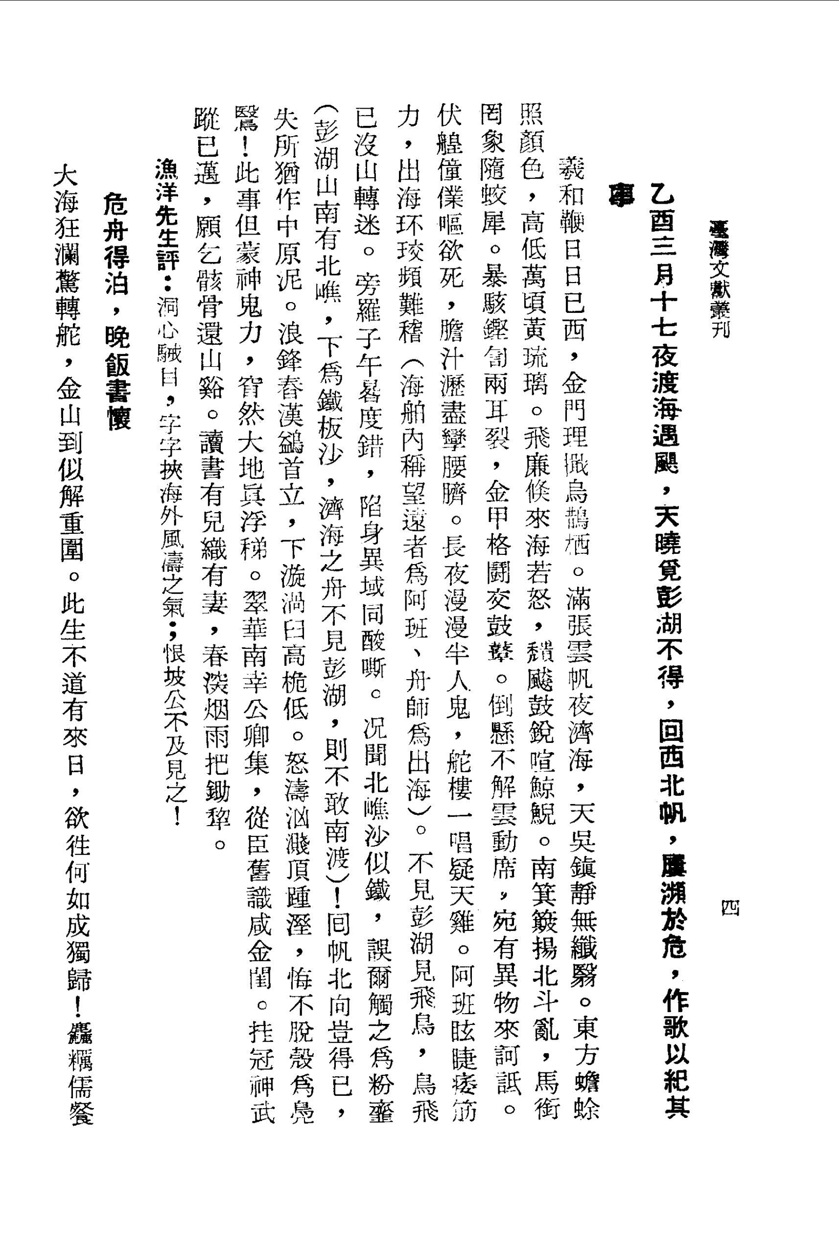 暴駭鏗訇兩耳裂,金甲格鬥交鼓鼙。倒懸不解雲動席,宛有異物來訶詆。伏艎僮□嘔欲死,膽汁瀝盡孿腰臍。長夜漫漫半人鬼,舵樓一唱疑天雞。阿班眩睫痿筋力,出海环珓頻難稽(海舶內稱望遠者為阿班、舟師為出海)。