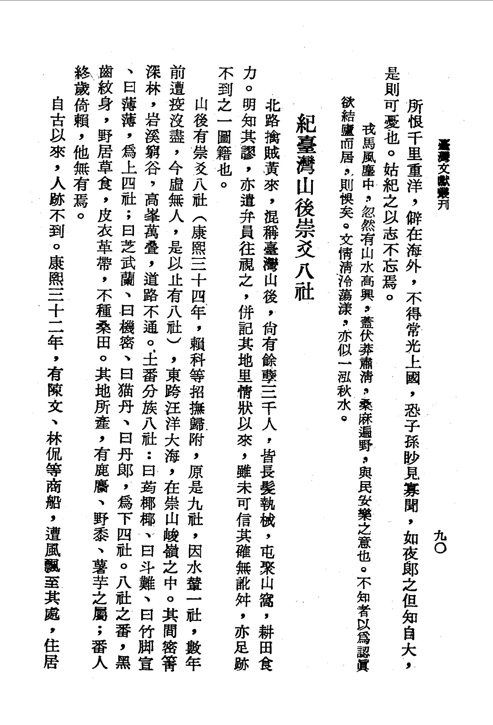 山後有崇爻八社(康熙三十四年,賴科等招撫歸附,原是九社,因水輦一社,數年前遭疫沒盡,今虛無人,是以止有八社),東跨汪洋大海,在崇山峻嶺之中。其間密箐深林,岩溪窮谷,高峰萬疊,道路不通。土番分族八社:曰荺椰椰、曰斗難、曰竹腳宣、曰薄薄,為上四社;曰芝武蘭、曰機密、曰貓丹、曰丹郎,為下四社。八社之番,黑齒紋身,野居草食,皮衣革帶,不種桑田。其地所產,有鹿麕、野黍、薯芋之屬;番人終歲倚賴,他無有焉。