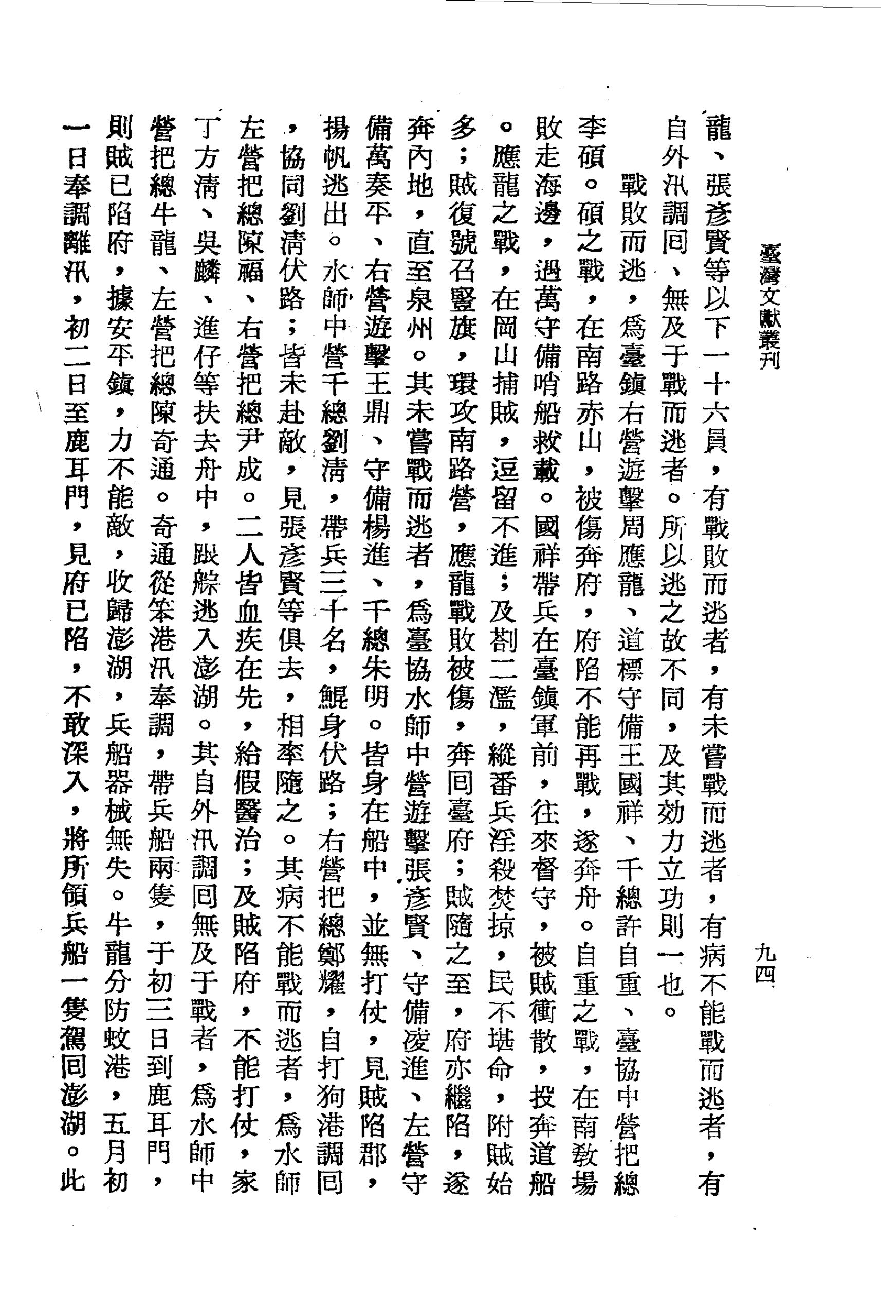 其病不能戰而逃者,為水師左營把總陳福、右營把總尹成。二人皆血疾在先,給假醫治;及賊陷府,不能打仗,家丁方清、吳麟、進仔等扶去舟中,跟□逃入澎湖。