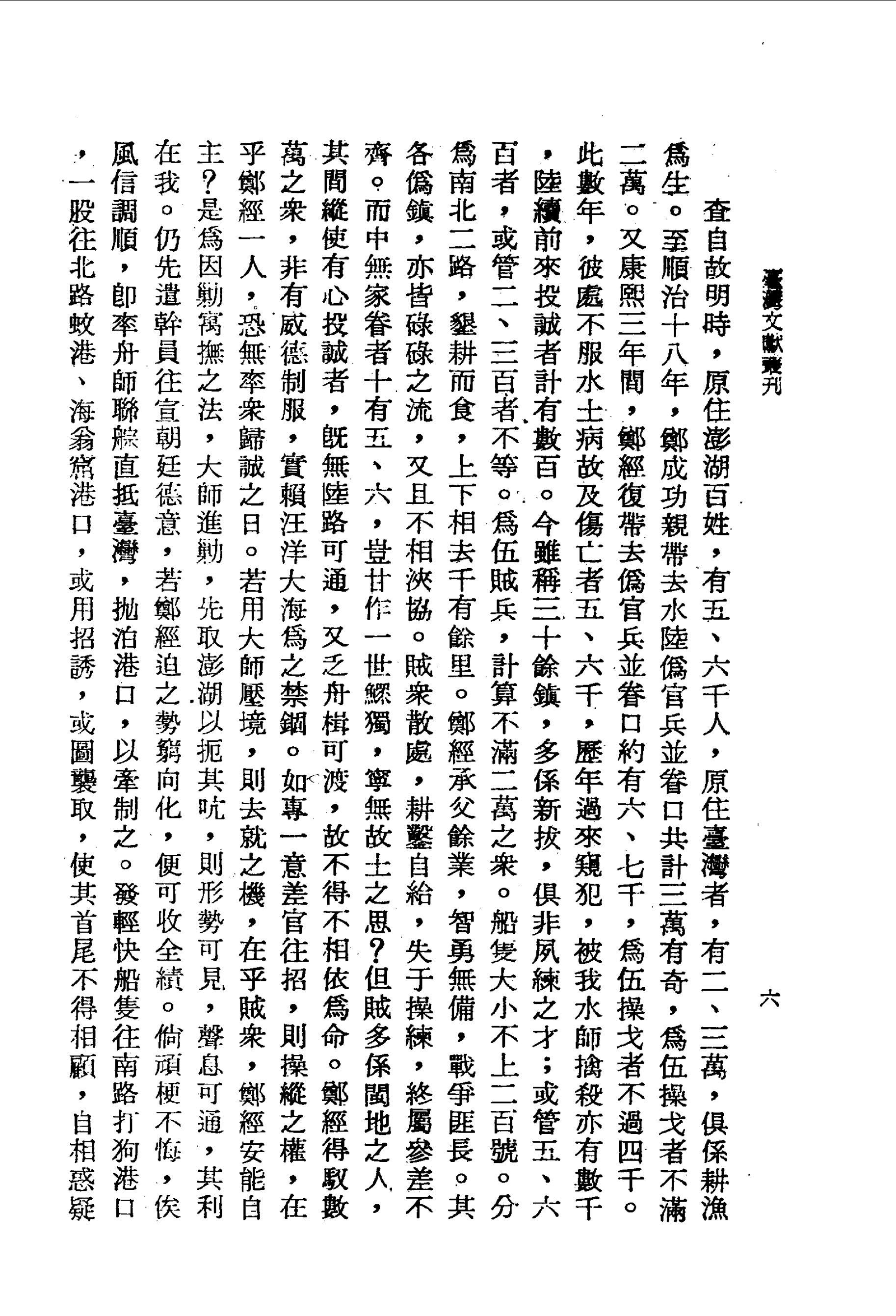 又康熙三年間,鄭經復帶去偽官兵並眷口約有六、七千,為伍操戈者不過四千。此數年,彼處不服水土病故及傷亡者五、六千,歷年過來窺犯,被我水師擒殺亦有數千,陸續前來投誠者計有數百。