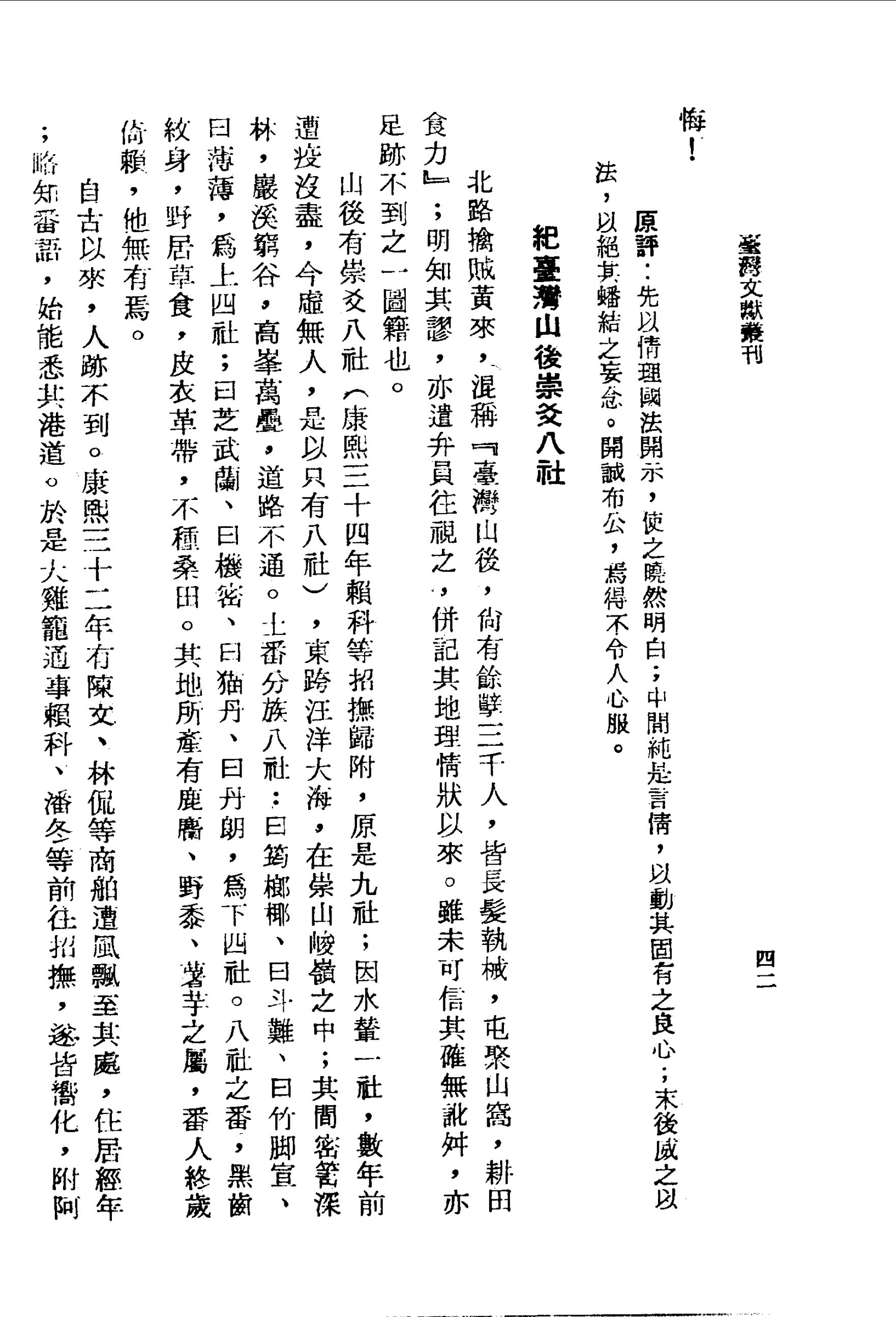 山後有崇爻八社(康熙三十四年賴科等招撫歸附,原是九社;因水輦一社,數年前遭疫沒盡,今虛無人,是以只有八社),東跨汪洋大海,在崇山峻嶺之中;其間密箐深林,巖溪窮谷,高峰萬疊,道路不通。