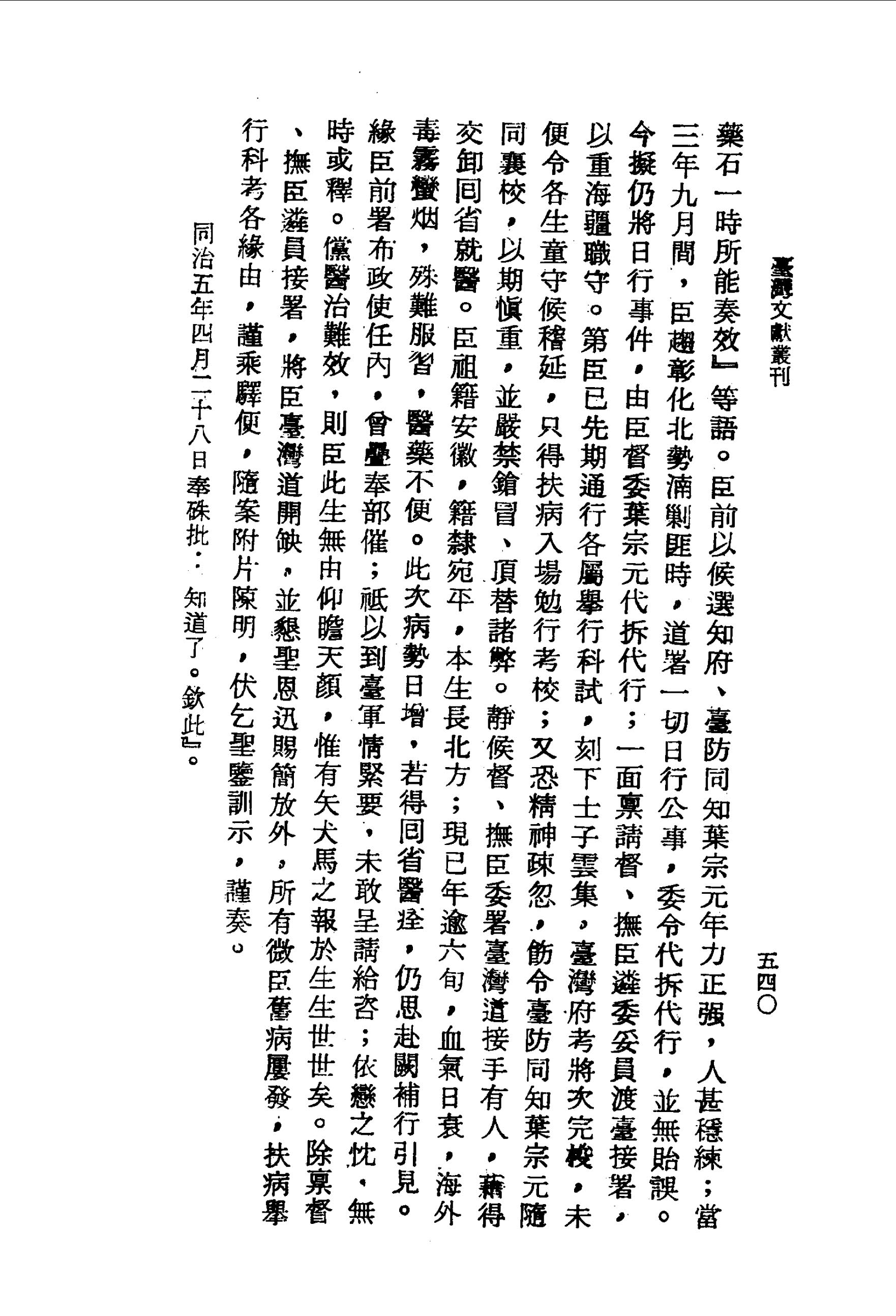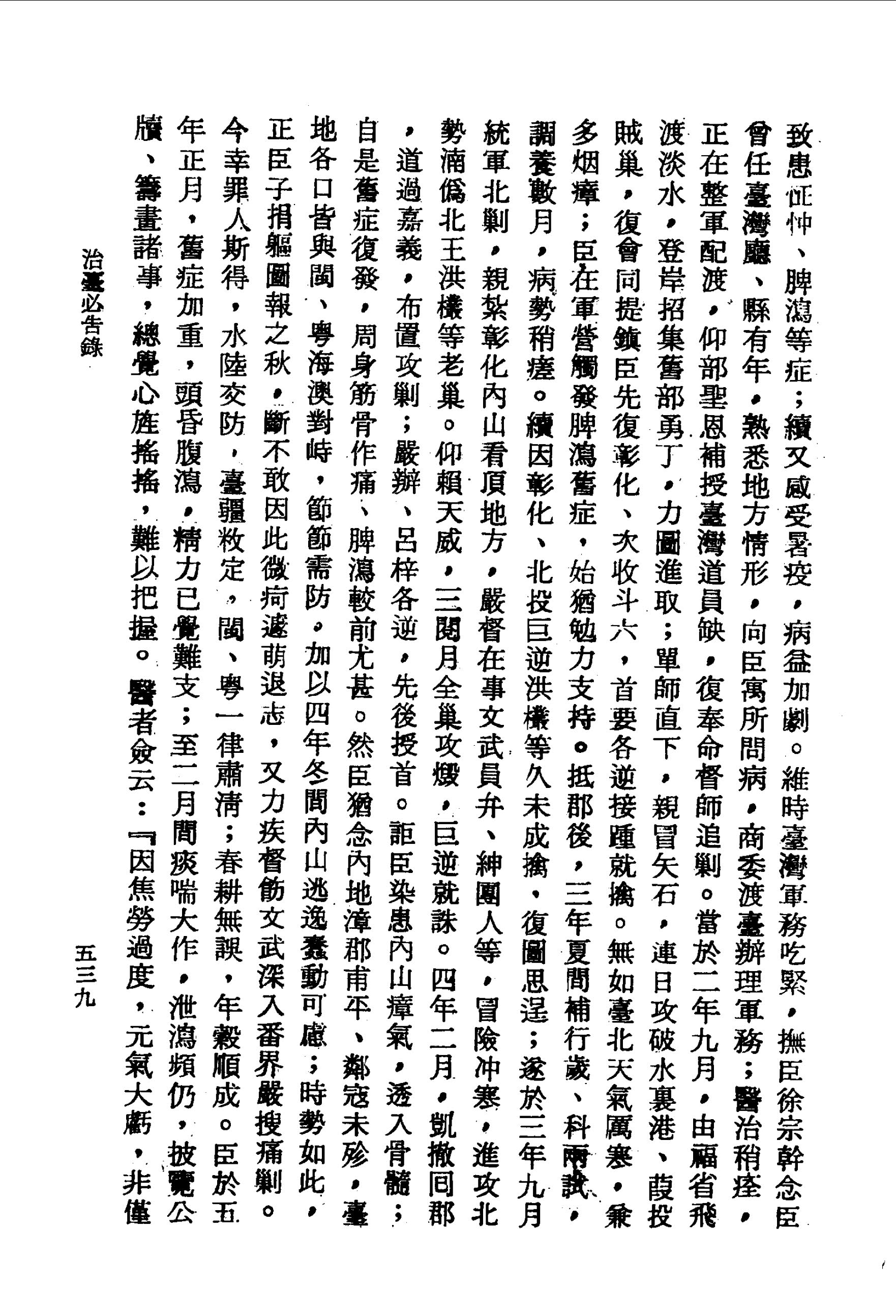 臣於五年正月,舊症加重,頭昏腹瀉,精力已覺難支;至二月間痰喘大作,泄瀉頻仍,披覽公牘、籌畫諸事,總覺心旌搖搖,難以把握。醫者僉云:『因焦勞過度,元氣大虧,非僅藥石一時所能奏效』等語。