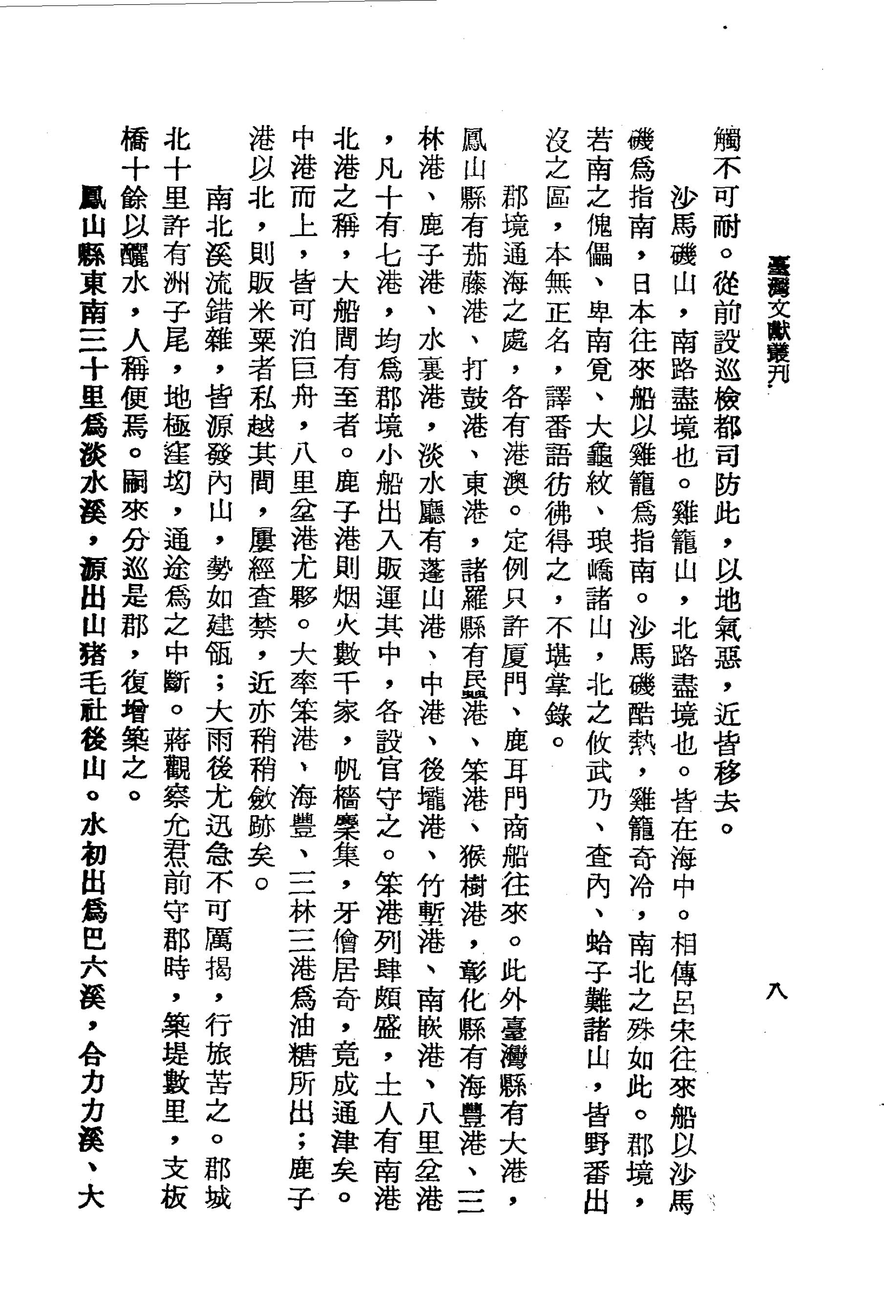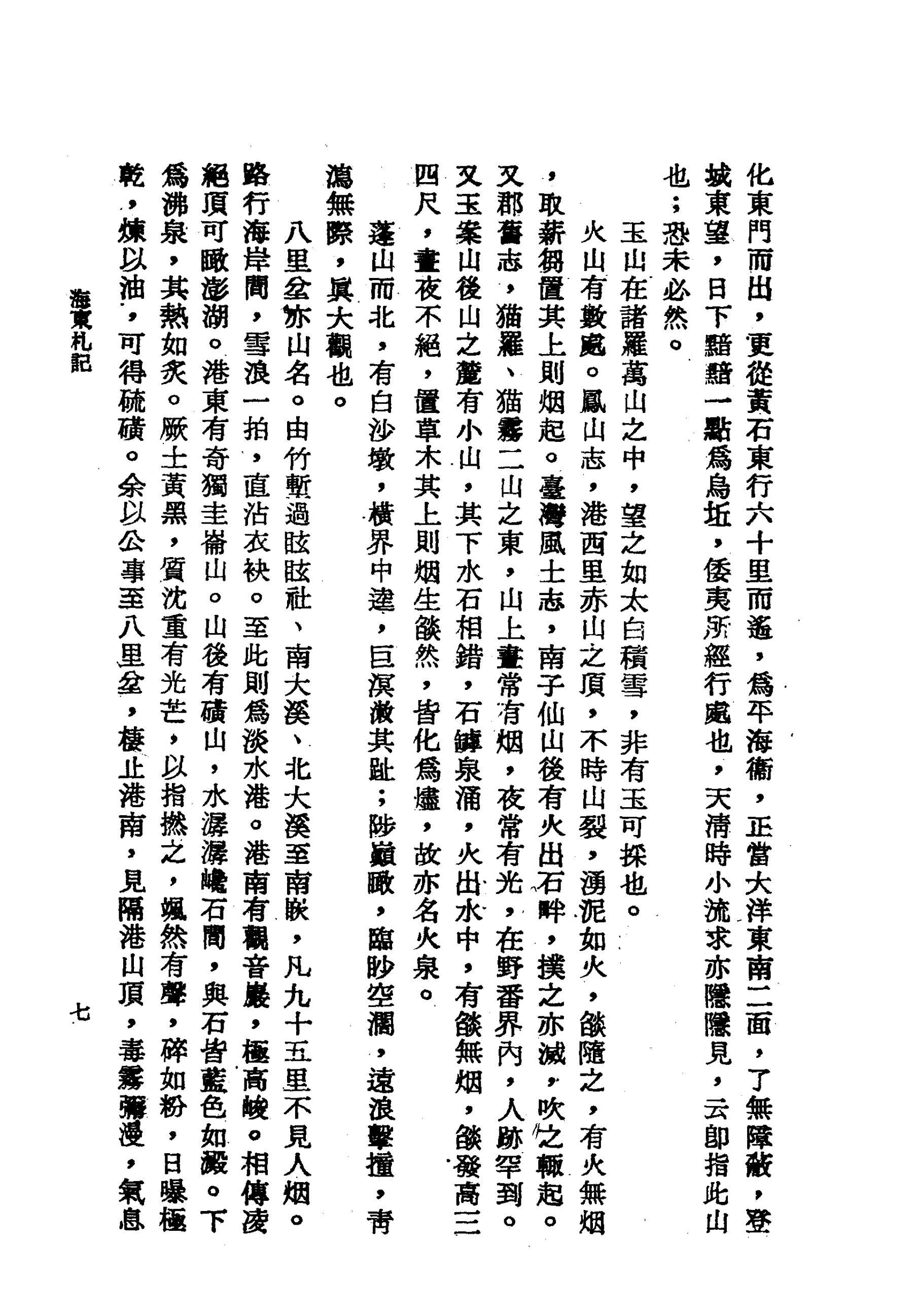 厥土黃黑,質沈重有光芒,以指撚之,颯然有聲,碎如粉,日曝極乾,煉以油,可得硫磺。余以公事至八里坌,棲止港南,見隔港山頂,毒霧彌漫,氣息觸不可耐。從前設巡檢都司防此,以地氣惡,近皆移去。