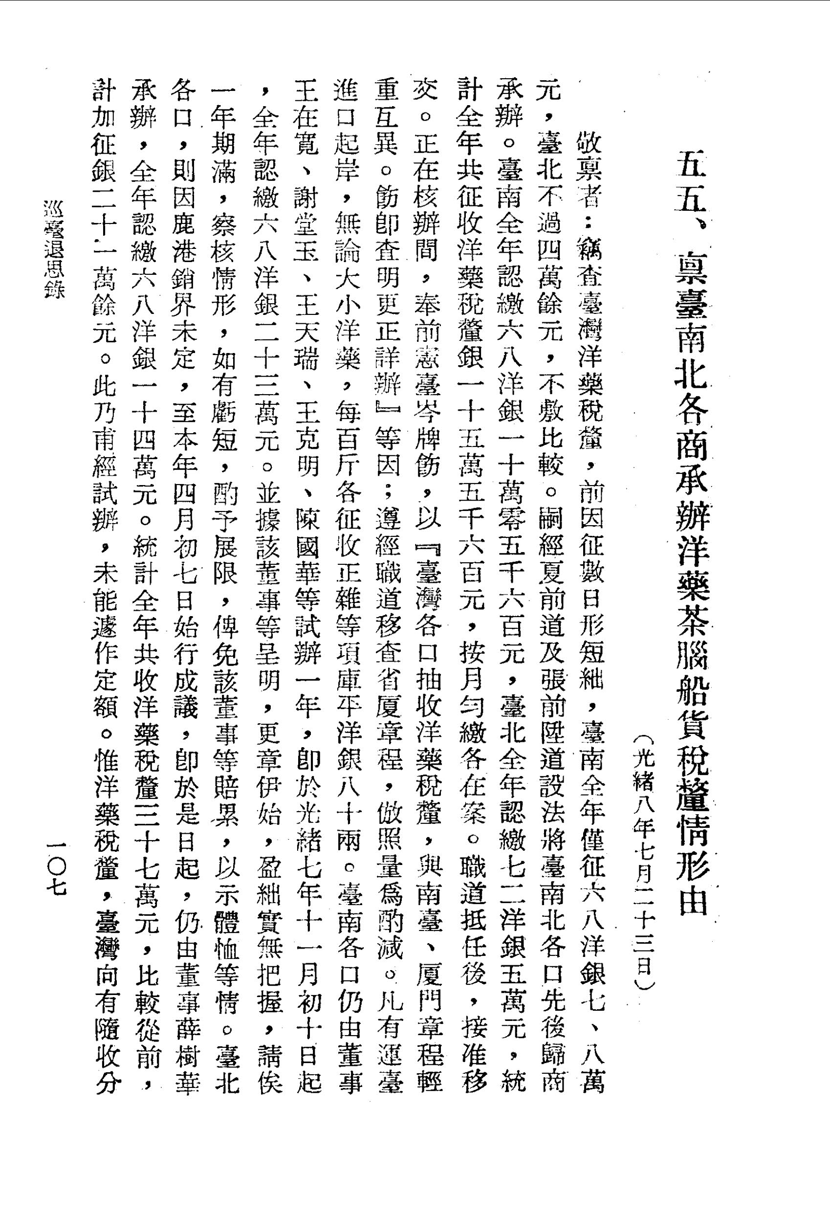 惟洋藥稅釐,臺灣向有隨收分治、育嬰、團練、郊行等費,既因加釐刪除,而地方應辦一切善舉,又未可偏廢,當與在地紳董妥為商酌,擬仍於前項征收銀八十兩內,提出雜款銀一十兩,歸新設「全臺培元局」,作為籌辦臺地各項善後事宜經費,以順輿情,而昭公允。