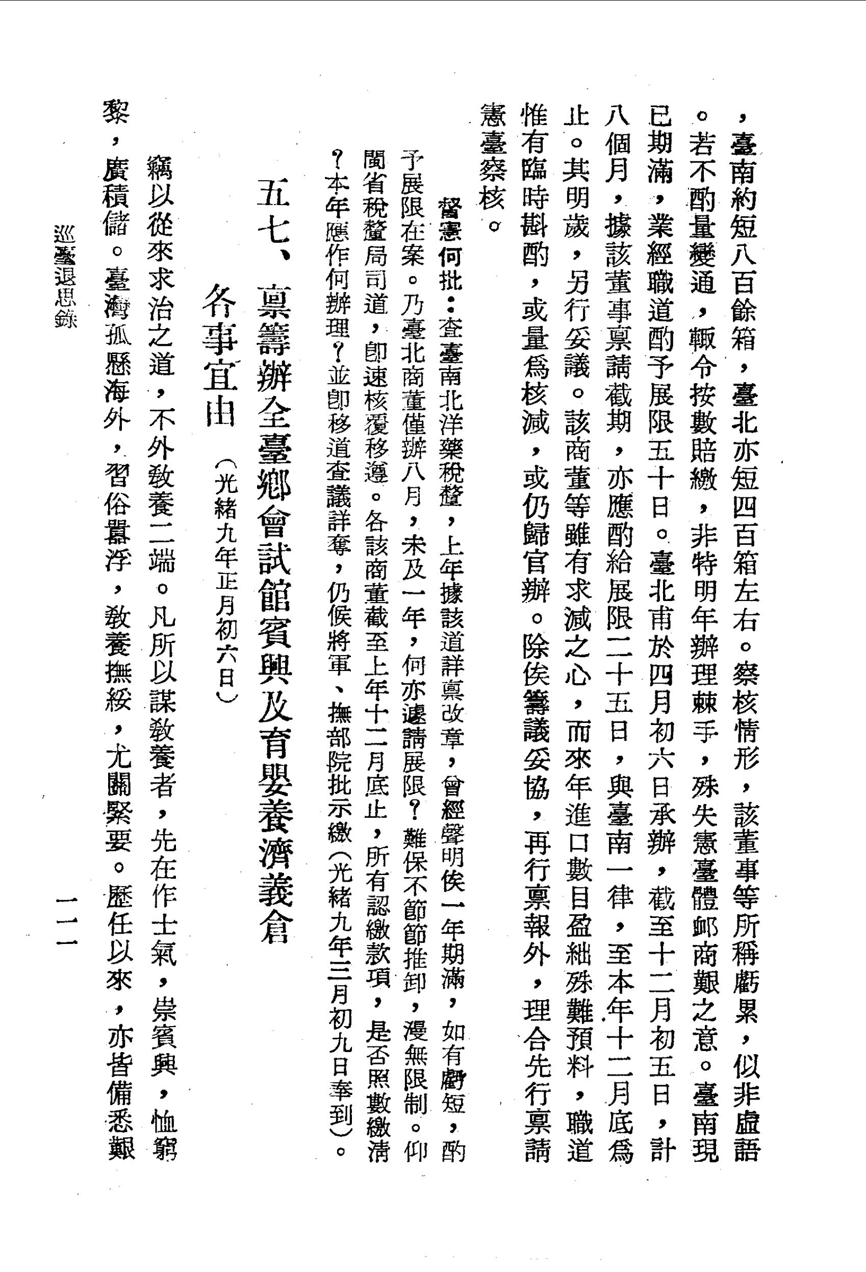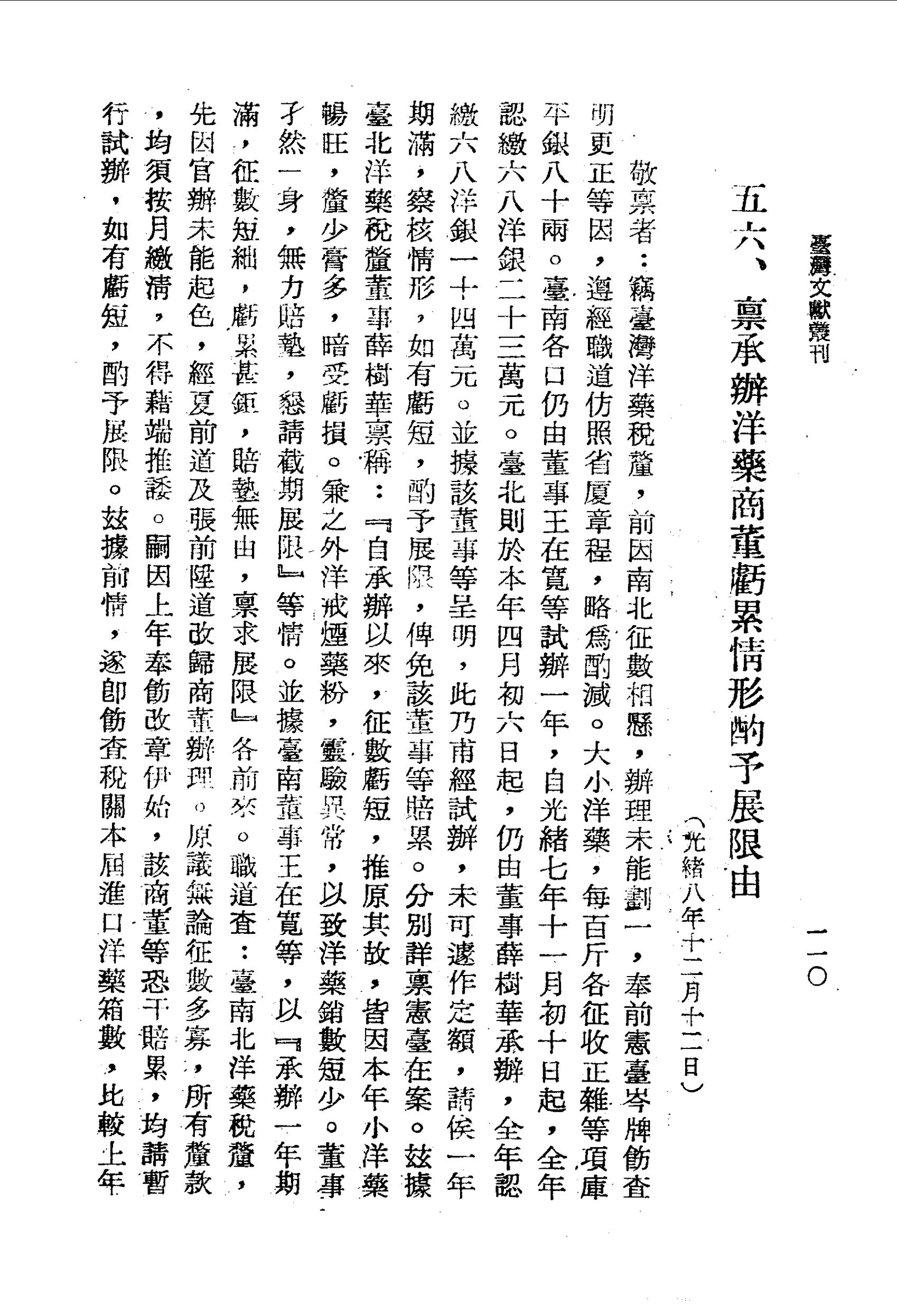 茲據前情,遂即飭查稅關本屆進口洋藥箱數,比較上年,臺南約短八百餘箱,臺北亦短四百箱左右。