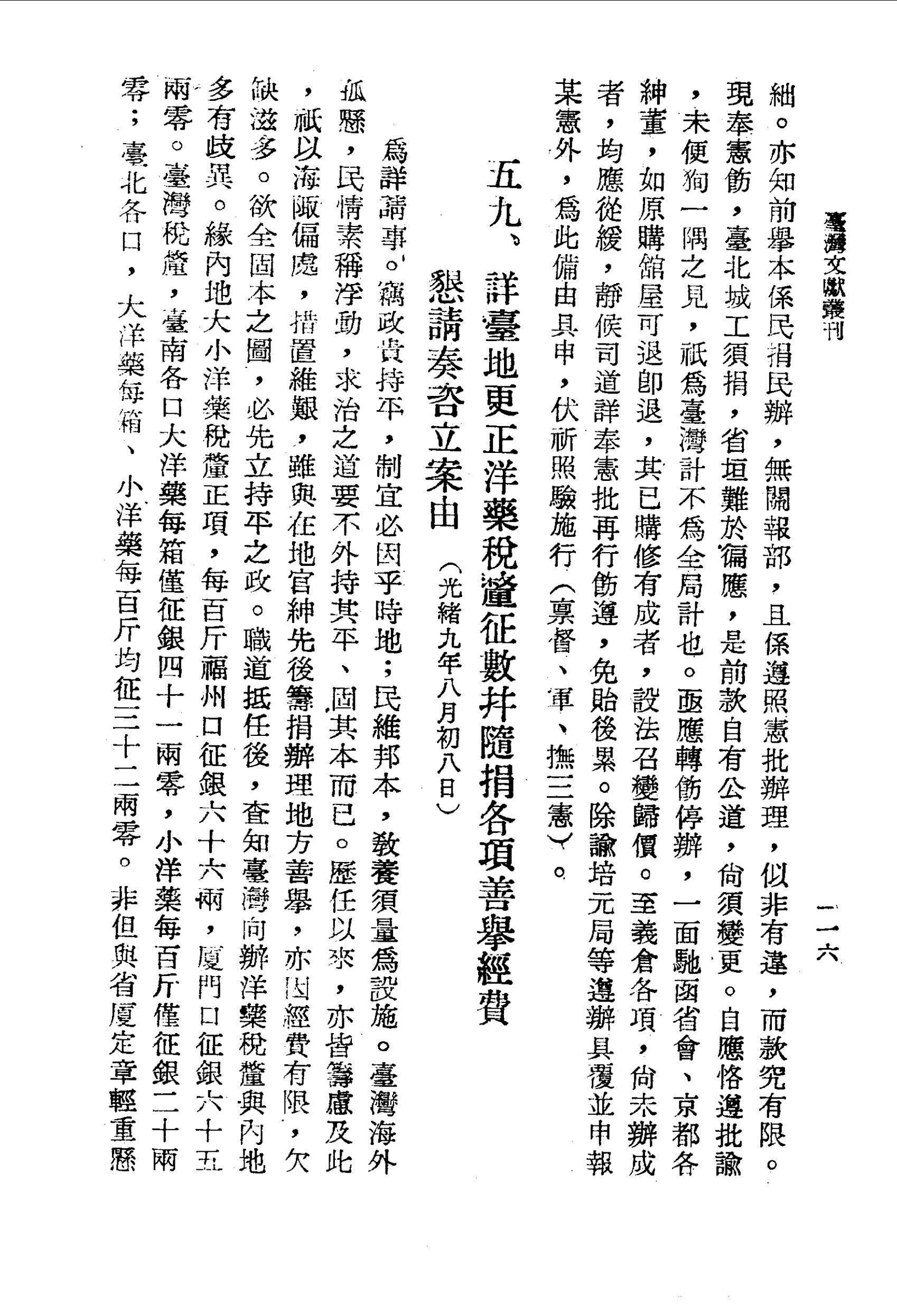 職道抵任後,查知臺灣向辦洋藥稅釐與內地多有歧異。緣內地大小洋藥稅釐正項,每百斤福州口征銀六十六兩,廈門口征銀六十五兩零。臺灣稅釐,臺南各口大洋藥每箱僅征銀四十一兩零,小洋藥每百斤僅征銀二十兩零;臺北各口,大洋藥每箱、小洋藥每百斤均征三十二兩零。當以此項洋藥稅釐,上有關乎餉項,下無礙於民生。