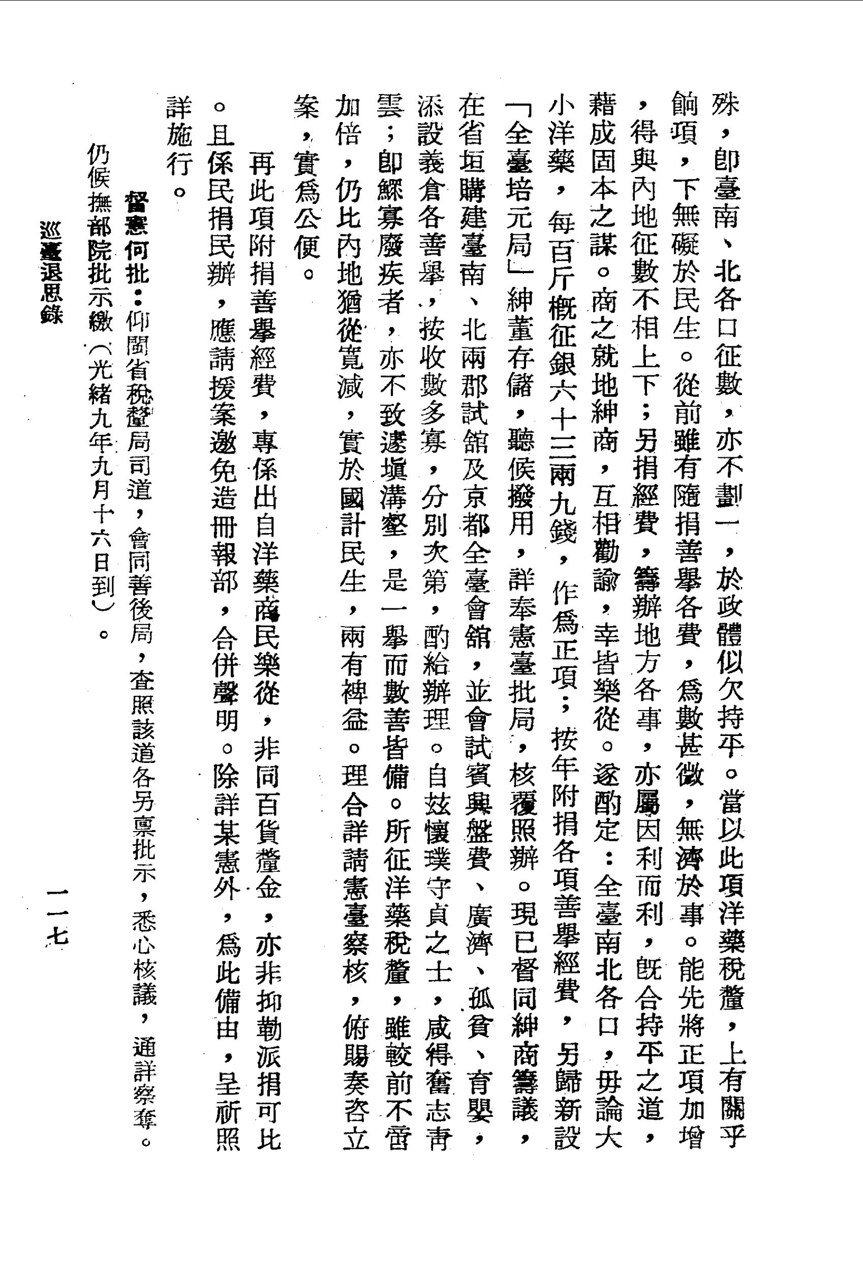 遂酌定:全臺南北各口,毋論大小洋藥,每百斤概征銀六十三兩九錢,作為正項;按年附捐各項善舉經費,另歸新設「全臺培元局」紳董存儲,聽候撥用,詳奉憲臺批局,核覆照辦。
