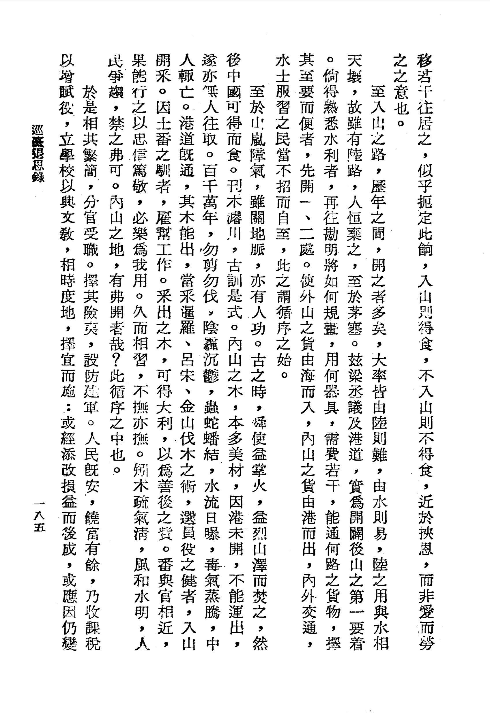 至於山嵐障氣,雖關地脈,亦有人功。古之時,舜使益掌火,益烈山澤而焚之,然後中國可得而食。刊木濬川,古訓是式。內山之木,本多美材,因港未開,不能運出,遂亦無人往取。百千萬年,勿剪勿伐,陰霾沈鬱,蟲蛇蟠結,水流日曝,毒氣蒸騰,中人輒亡。港道既通,其木能出,當采暹羅、呂宋、金山伐木之術,選員役之健者,入山開采。因土番之馴者,雇幫工作。采出之木,可得大利,以為善後之貲。番與官相近,果能行之以忠信篤敬,必樂為我用。久而相習,不撫亦撫。矧木疏氣清,風和水明,人民爭趨,禁之弗可。內山之地,有弗開者哉?此循序之中也。
