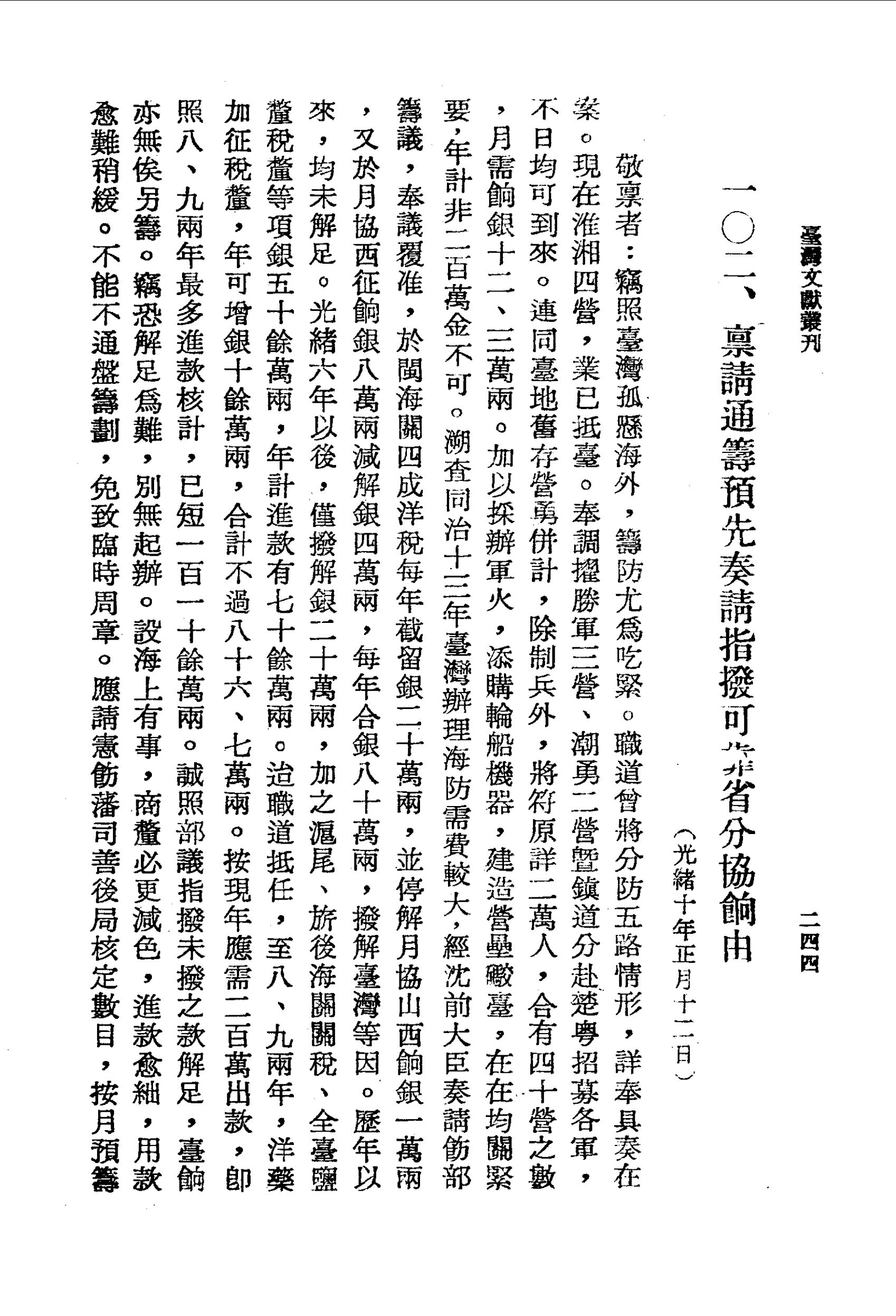 迨職道抵任,至八、九兩年,洋藥加征稅釐,年可增銀十餘萬兩,合計不過八十六、七萬兩。按現年應需二百萬出款,即照八、九兩年最多進款核計,已短一百一十餘萬兩。