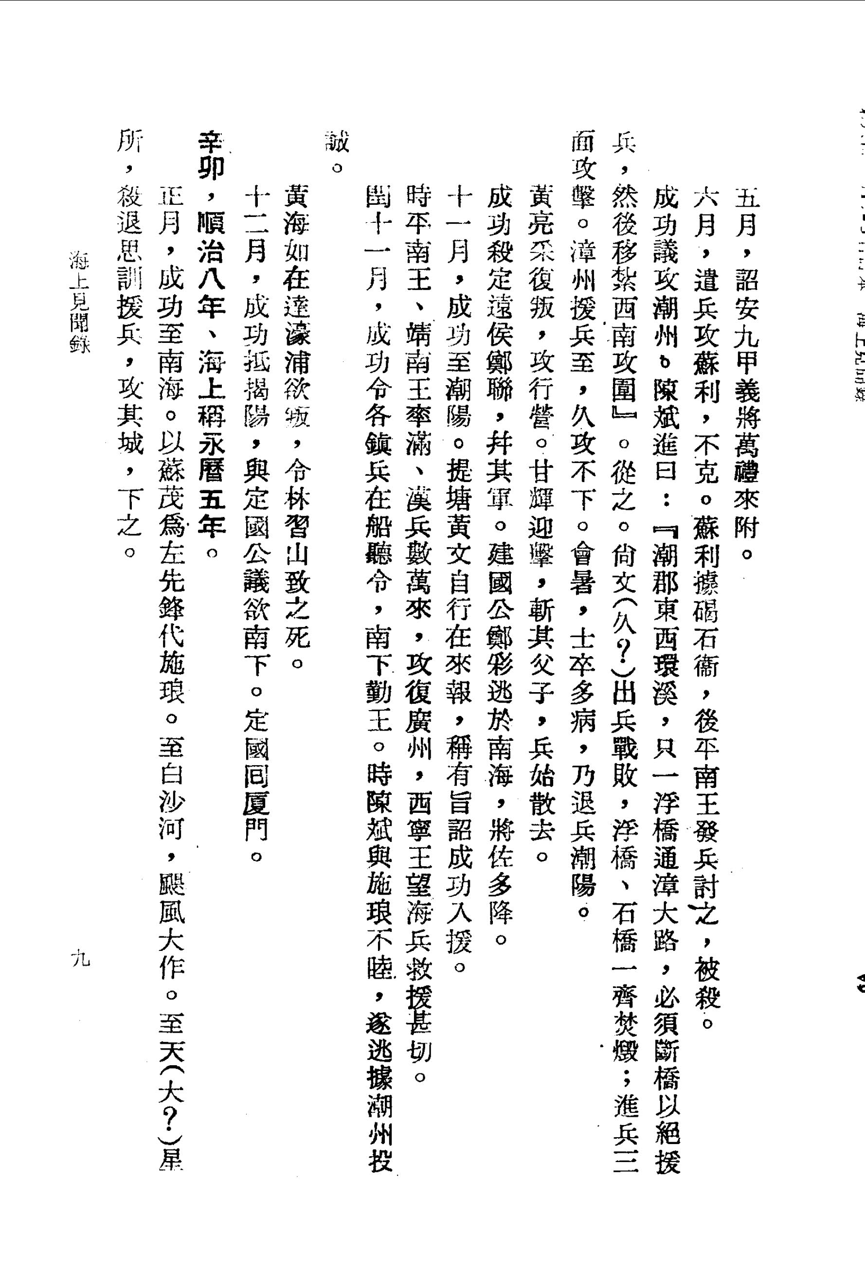 成功議攻潮州。陳斌進曰:『潮郡東西環溪,只一浮橋通漳大路,必須斷橋以絕援兵,然後移紮西南攻圍』。從之。尚文(久?)出兵戰敗,浮橋、石橋一齊焚燬;進兵三面攻擊。 漳州援兵至,久攻不下。會暑,士卒多病,乃退兵潮陽。