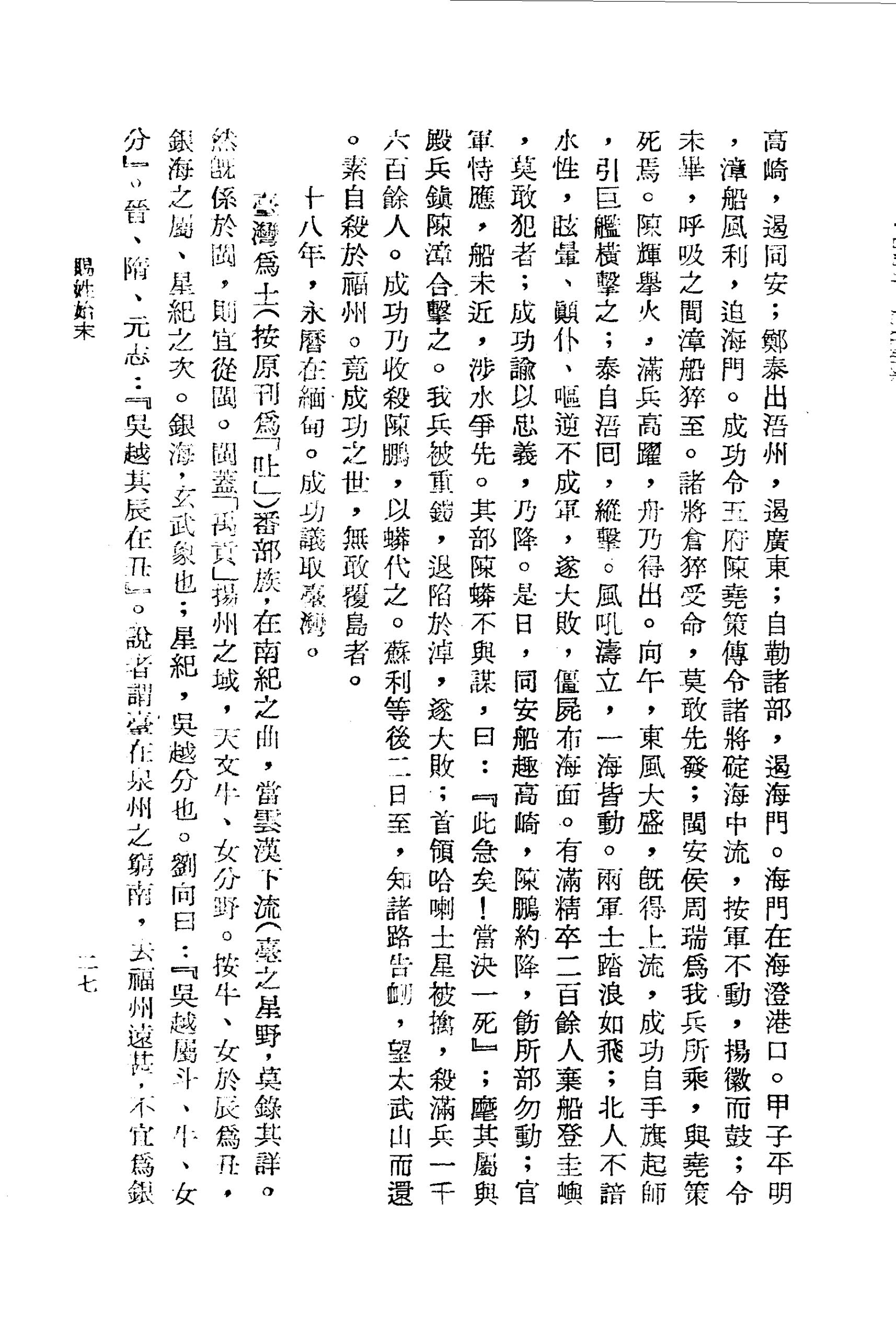 向午,東風大盛,既得上流,成功自手旗起師,引巨艦橫擊之;泰自浯回,縱擊。風吼濤立,一海皆動。兩軍士踏浪如飛; 兩軍士踏浪如飛;北人不諳水性,眩暈、顛仆、嘔逆不成軍,遂大敗,僵屍布海面。