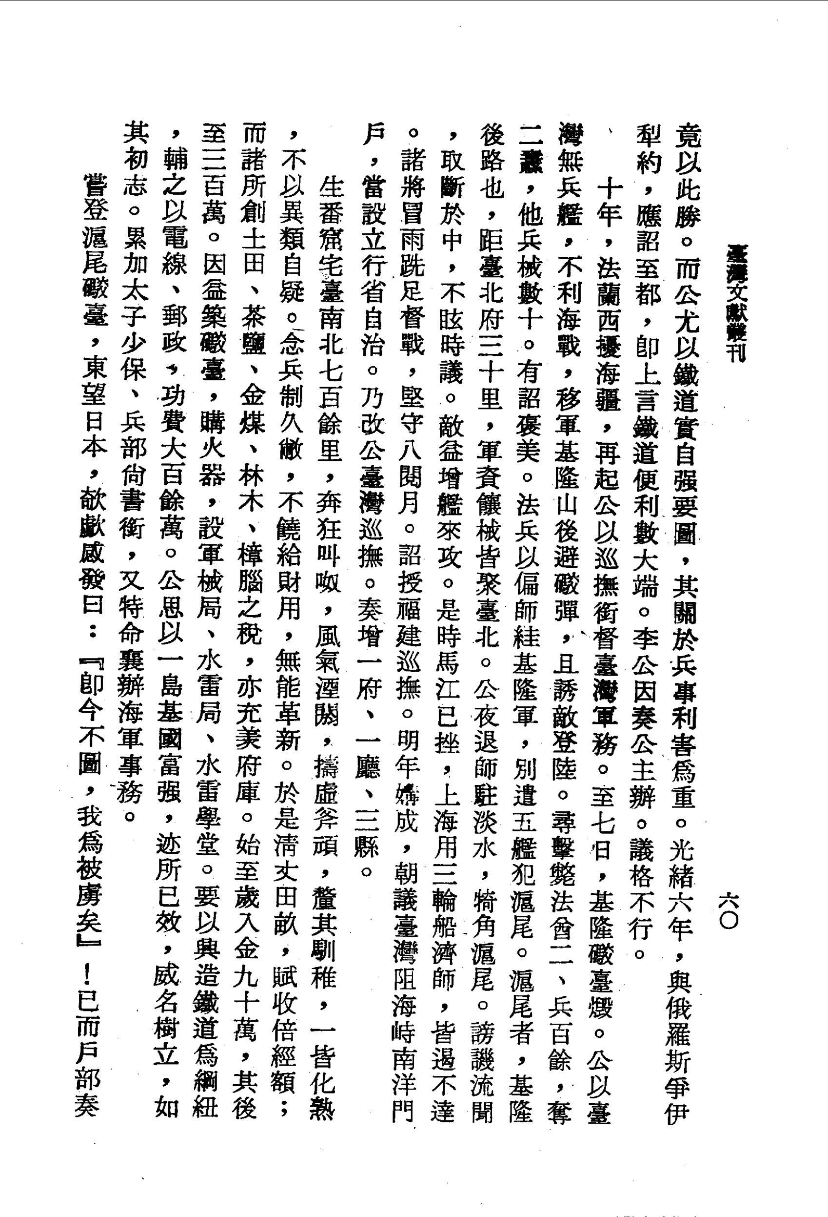 生番窟宅臺南北七百餘里,奔狂叫呶,風氣湮閼,擣虛斧頑,釐其馴稚,一皆化熟,不以異類自疑。念兵制久敝,不饒給財用,無能革新。於是清丈田畝,賦收倍經額;而諸所創土田、茶鹽、金煤、林木、樟腦之稅,亦充羨府庫。始至歲入金九十萬,其後至三百萬。因益築礮臺,購火器,設軍械局、水雷局、水雷學堂。要以興造鐵道為綱紐,輔之以電線、郵政,功費大百餘萬。