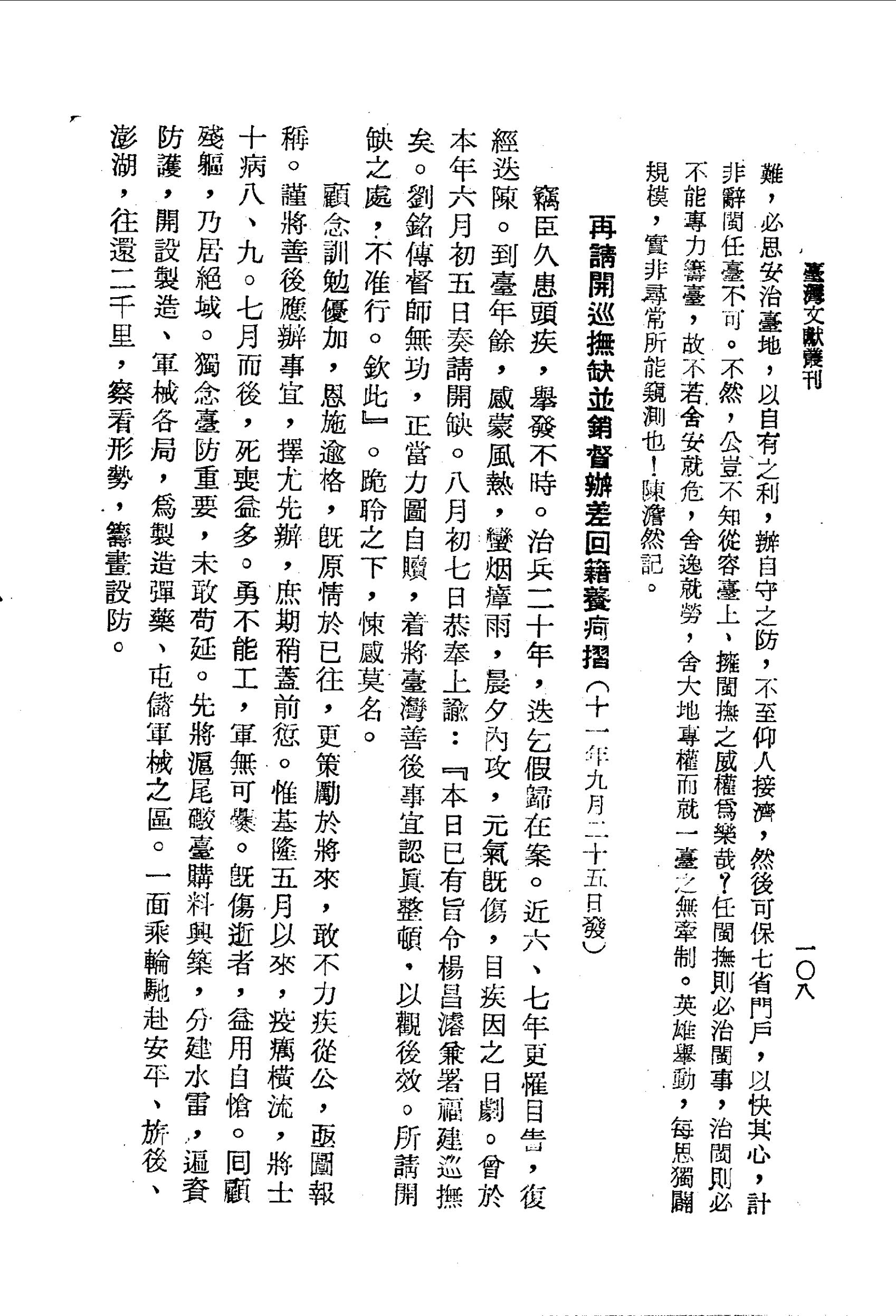 竊臣久患頭疾,舉發不時。治兵二十年,迭乞假歸在案。近六、七年更罹目眚,復經迭陳。到臺年餘,感蒙風熱,蠻煙瘴雨,晨夕內攻,元氣既傷,目疾因之日劇。曾於本年六月初五日奏請開缺。