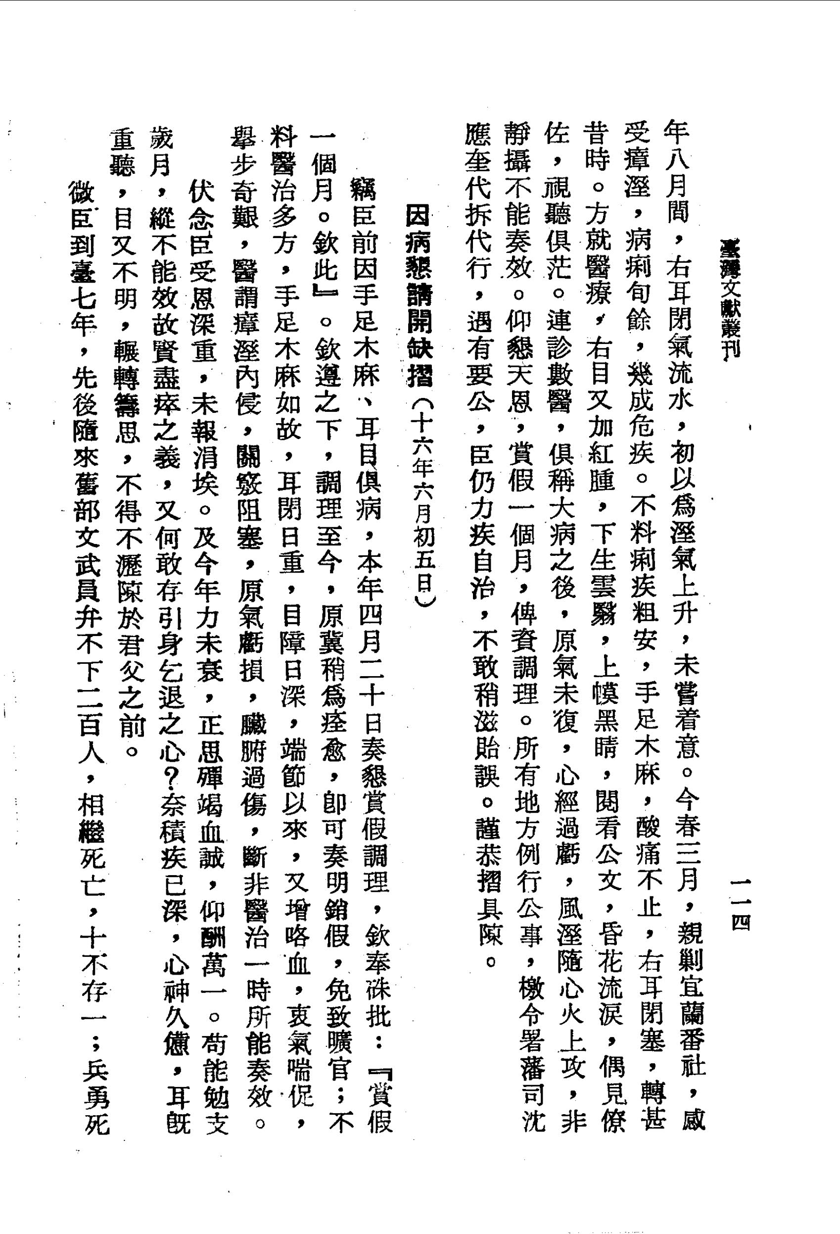 竊臣前因手足木麻、耳目俱病,本年四月二十日奏懇賞假調理,欽奉硃批:『賞假一個月。欽此』。欽遵之下,調理至今,原冀稍為痊愈,即可奏明銷假,免致曠官;不料醫治多方,手足木麻如故,耳閉日重,目障日深,端節以來,又增咯血,衷氣喘促,舉步奇艱,醫謂瘴溼內侵,關竅阻塞,原氣虧損,臟腑過傷,斷非醫治一時所能奏效。