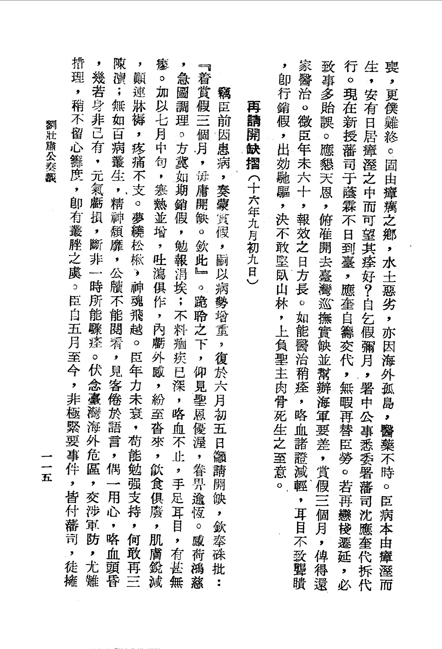 固由瘴癘之鄉,水土惡劣,亦因海外孤島,醫藥不時。臣病本由瘴溼而生,安有日居瘴溼之中而可望其痊好?自乞假彌月,署中公事悉委署藩司沈應奎代拆代行。現在新授藩司于蔭霖不日到臺,應奎自籌交代,無暇再替臣勞。若再戀棧遷延,必致事多貽誤。應懇天恩,俯准開去臺灣巡撫實缺並幫辦海軍要差,賞假三個月,俾得還家醫治。