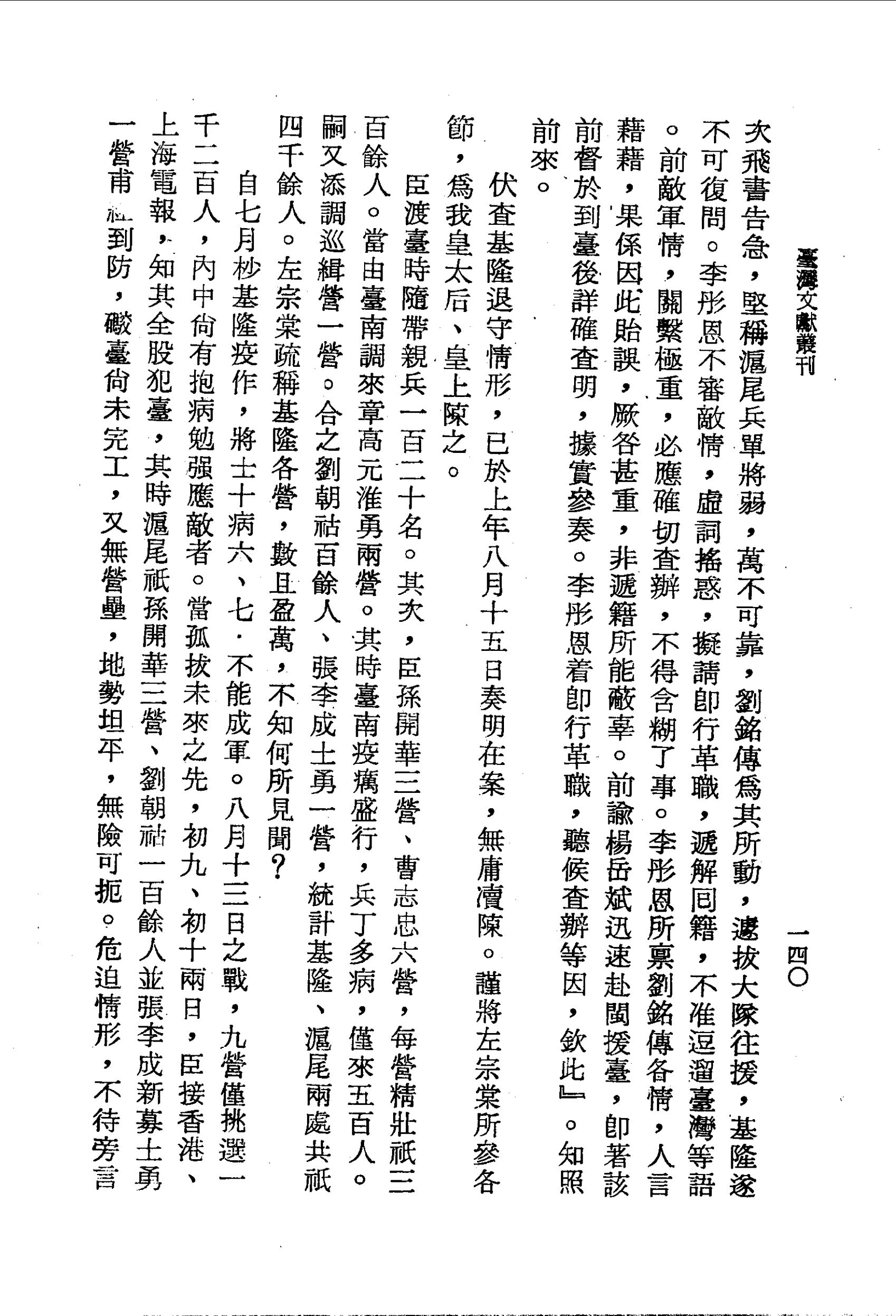臣渡臺時隨帶親兵一百二十名。其次,臣孫開華三營、曹志忠六營,每營精壯祇三百餘人。當由臺南調來章高元淮勇兩營。其時臺南疫癘盛行,兵丁多病,僅來五百人。