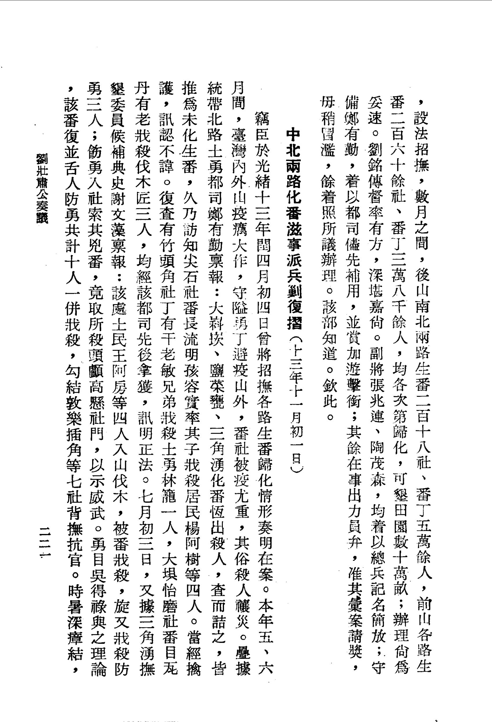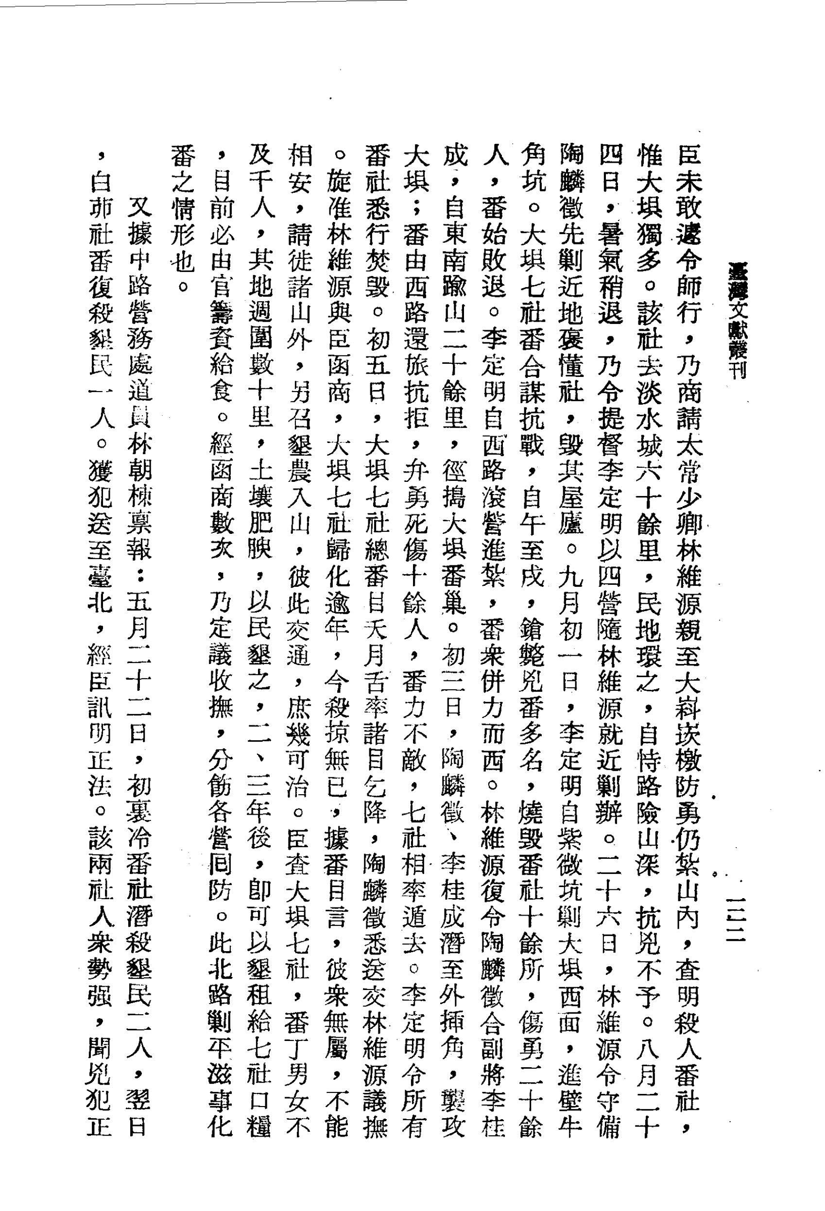 時暑深瘴結,臣未敢遽令師行,乃商請太常少卿林維源親至大嵙崁檄防勇仍紮山內,查明殺人番社,惟大埧獨多。該社去淡水城六十餘里,民地環之,自恃路險山深,抗兇不予。八月二十四日,暑氣稍退,乃令提督李定明以四營隨林維源就近勦辦。