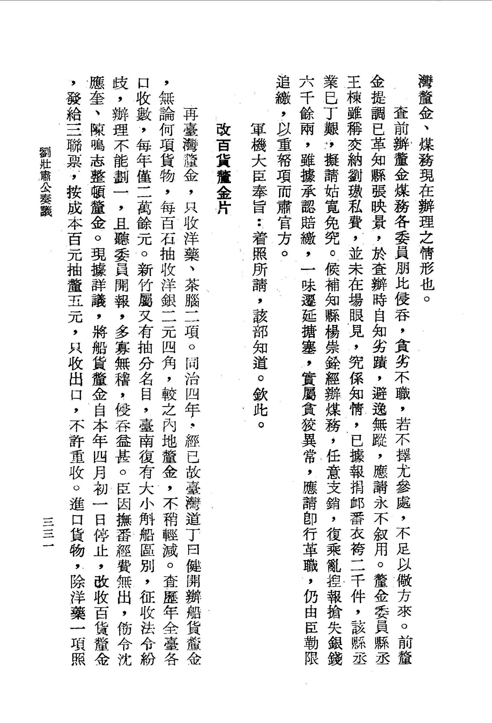再臺灣釐金,只收洋藥、茶腦二項。同治四年,經已故臺灣道丁曰健開辦船貨釐金,無論何項貨物,每百石抽收洋銀二元四角,較之內地釐金,不稍輕減。