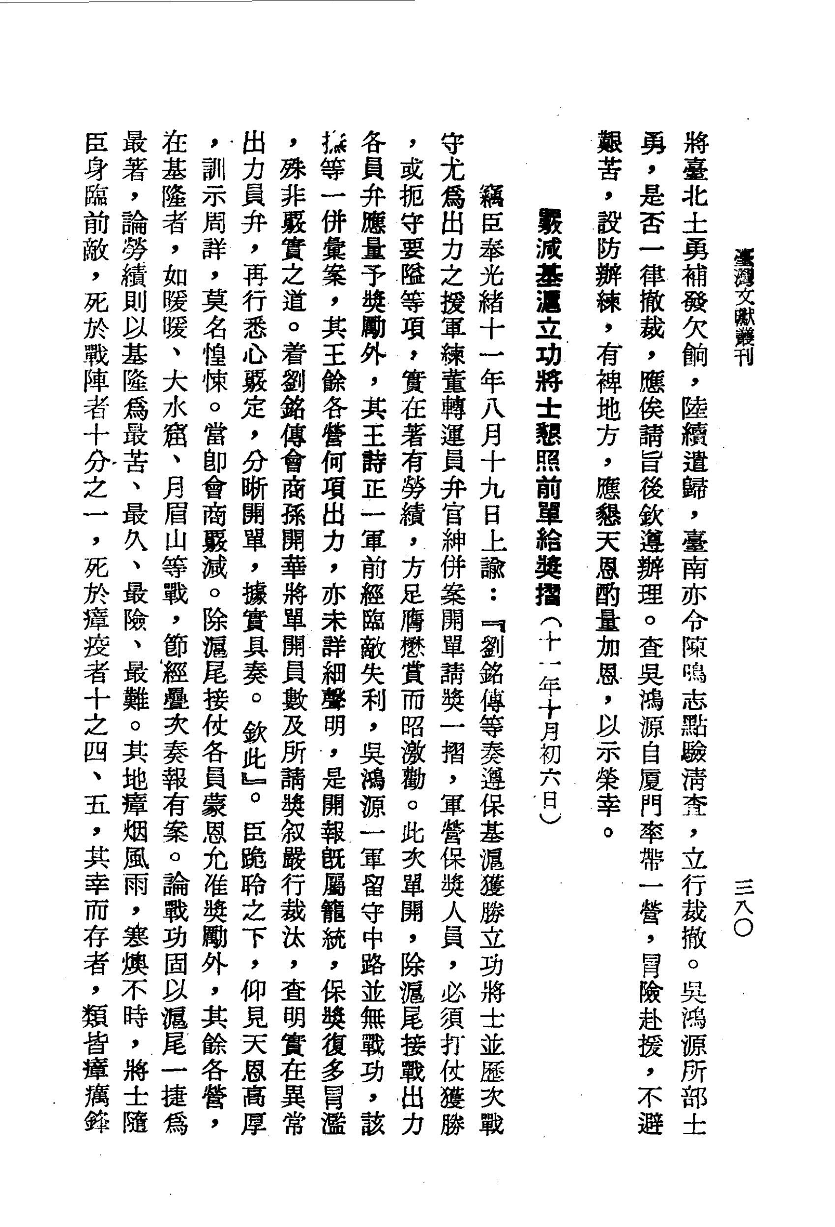 論戰功固以滬尾一捷為最著,論勞績則以基隆為最苦、最久、最險、最難。其地瘴煙風雨,寒燠不時,將士隨臣身臨前敵,死於戰陣者十分之一,死於瘴疫者十之四、五,其幸而存者,類皆瘴癘鋒鏑餘生,恍如再世。