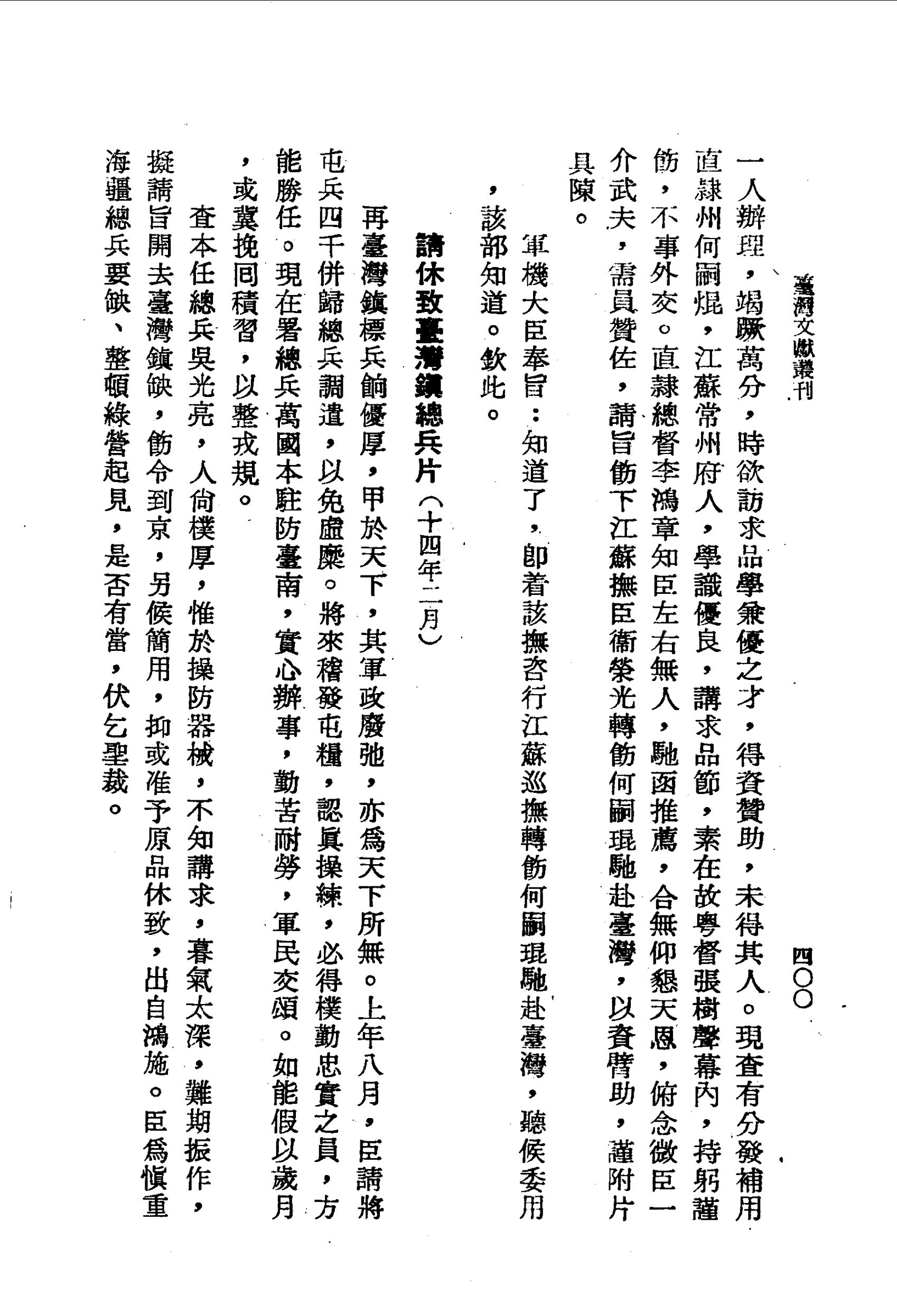再臣於光緒十年渡臺之際,奏留已革安徽候補道裕庚辦理文案,該道公事嫻熟,臂助實多,不料到臺後溼熱上沖,目疾沈重,上年五月請假內渡就醫,文牘、軍書,皆臣一人辦理,竭蹶萬分,時欲訪求品學兼優之才,得資贊助,未得其人。現查有分發補用直隸州何嗣焜,江蘇常州府人,學識優良,講求品節,素在故粵督張樹聲幕內,持躬謹飭,不事外交。